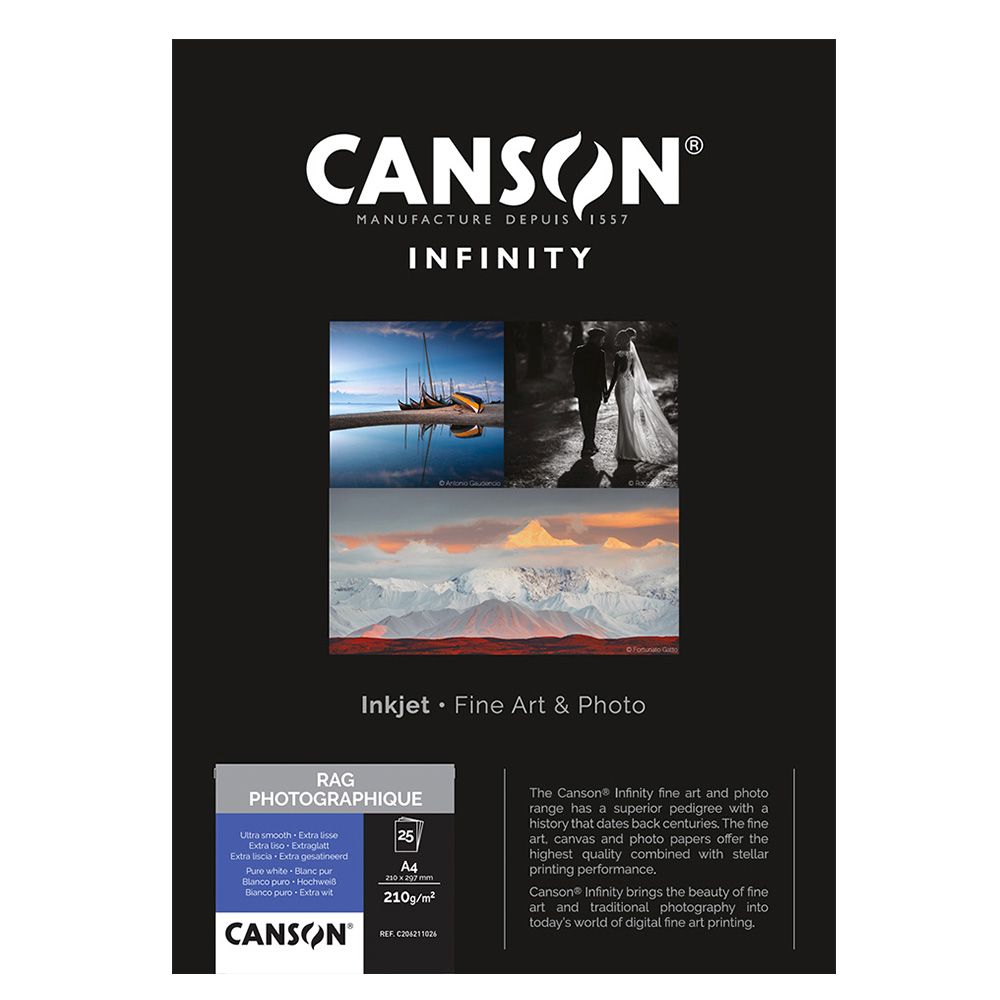 Canson Infinity Rag Photographique is a 100% cotton museum grade white Fine Art and photo paper. The exceptional smooth white tone is achieved during manufacturing by introducing natural minerals to the process. It has been developed to address the need for continued longevity requirements in the Digital Fine Art market.