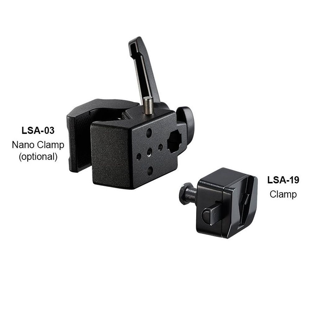 This Clamp is useful for attaching V-mount accessories such as V-mount batteries. The clamp has a female channel on one side and a hex stud on the other to fit neatly into the LSA-03 Nano Clamp so you can attach the supported item to a stand, a pole, or a truss.