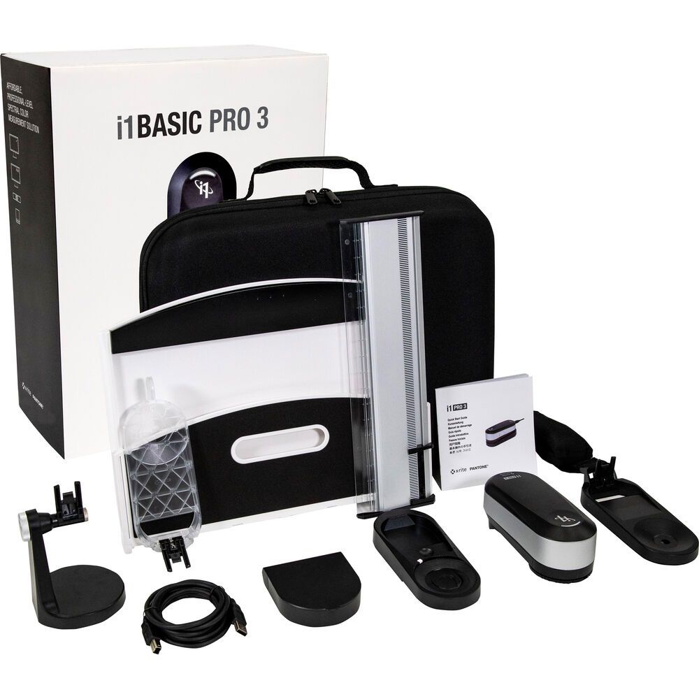 i1Basic Pro 3 includes the i1Pro 3 Spectrophotometer; i1Profiler Software; PANTONE Color Manager Software; and robust i1 accessories (Ambient Light Measurement Head, Monitor Holder, Scanning Ruler, Backup Board, Spot Color Positioning Target, Soft Carrying Case).