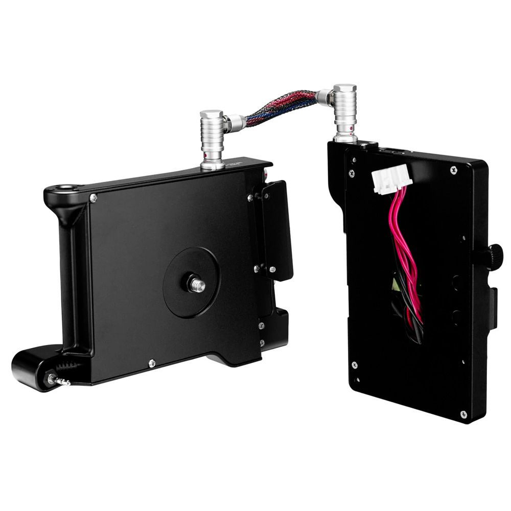 The Side Plate attaches via the ARRI Standard Rosette on the side of the camera for Power Distribution and Camera Control Syncing. A cable connects the two plates, allowing users to hot-swap between the DC input and the onboard battery. The Side Plate features three mounting points for accessories. One 3/8-16 mounting point with ARRI-standard locating pins can be found on the front of the side plate and another can be found on the top. Since the side plate attaches to the native ARRI-Standard rosette on the side of the camera, an ARRI-Standard rosette has been added to the front of the side plate so as to not lose existing accessory compatibility that relies on the camera’s native rosette.