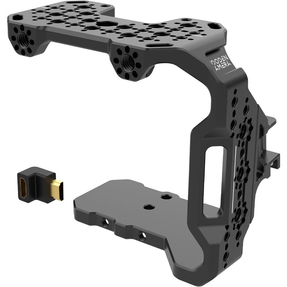 Accessories can be mounted around the cage using the 1/4"-20 and 3/8"-16 threads that feature ARRI-style anti-twist locating holes. There is also a shoe mount on top and two 3/8"-16 mounting threads on the front of the cage to add optional rod mounts, microphones, lights, or other accessories. Pass-through slots on the side allow you to manage your cables. An HDMI right-angle adapter and HDMI/USB cable clamp are included to protect the camera's cable ports from cable pulls and snags.