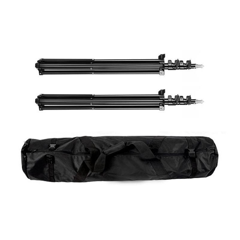The system consists of 2x 2.6m heavy duty professional support stands with 3 positive locking knobs and tubular legs, a 3m telescopic crossbar and a heavy-duty canvas carry bag.