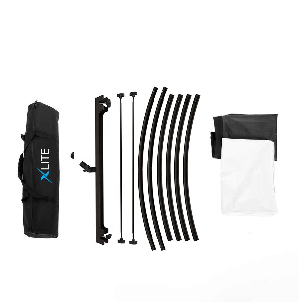 The Xlite Studio Eyelighter 4:1 Curved Reflector features an arc-shaped design to make a subject's eyes sparkle in portrait photography. Reflecting light from three perspectives, the reflector eliminates shadows. It's suitable for strobes, monolights, LED lights, and even natural sunlight. Six interlocking curved tubes, two rugged metal rods, and screw knobs enable you to assemble the reflector in minutes without any tools. The curved tubes and rods insert into dedicated rod pockets and stretch the reflector out.