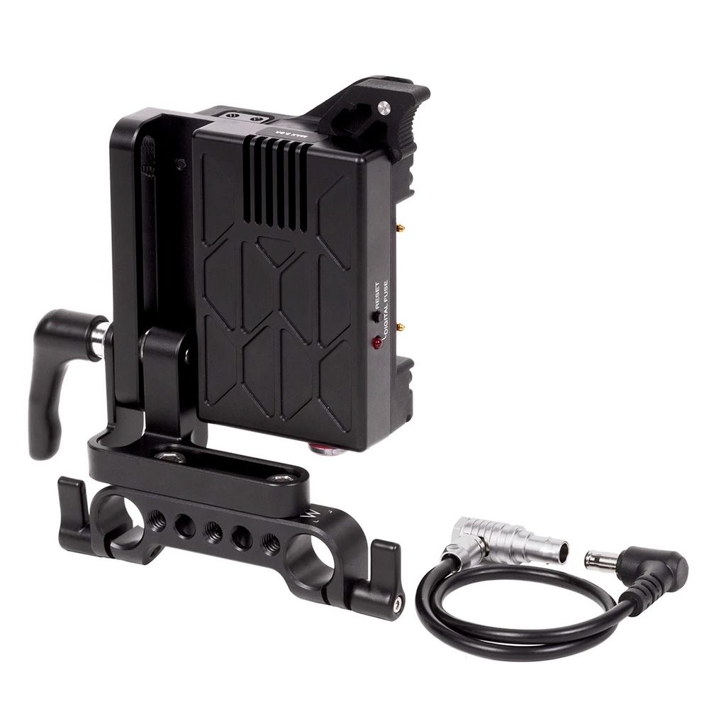 It also features two D-Tap (5.8 Amps) ports for accessory power as well as a digital fuse which cuts off accessory outputs, should the user exceed the set current for accessories, while leaving the camera powered. Once the current load has been reduced by either removing accessories or reconfiguring, the reset button can be pressed to enable accessory power again.