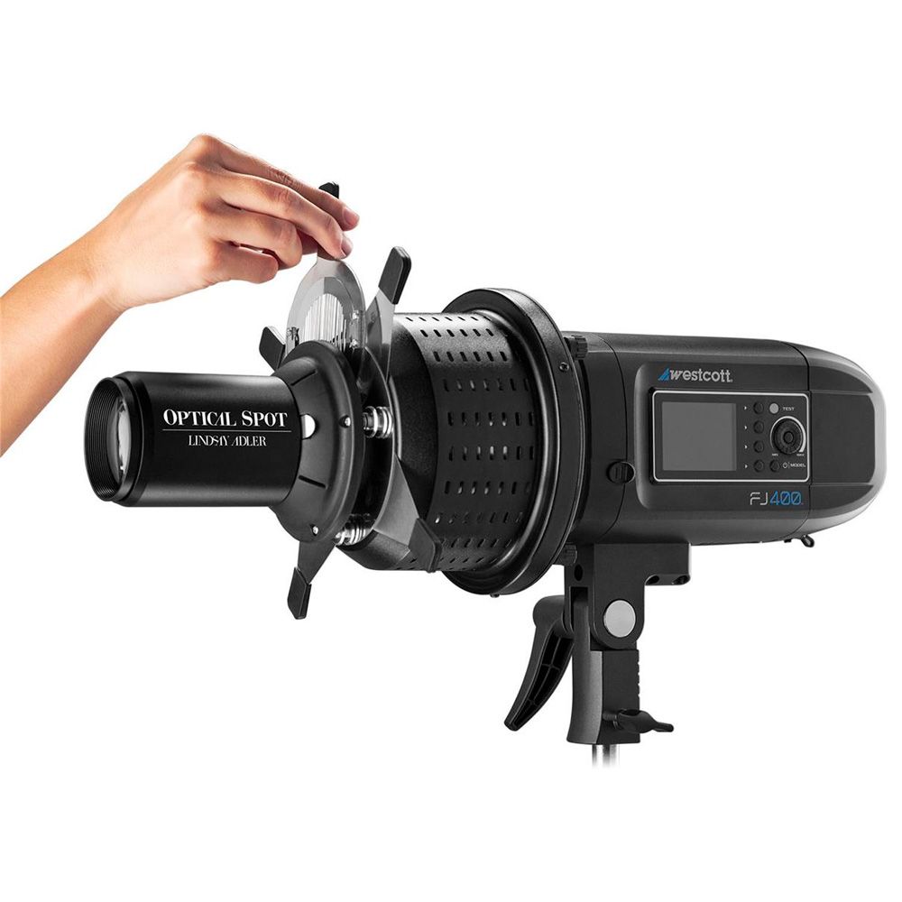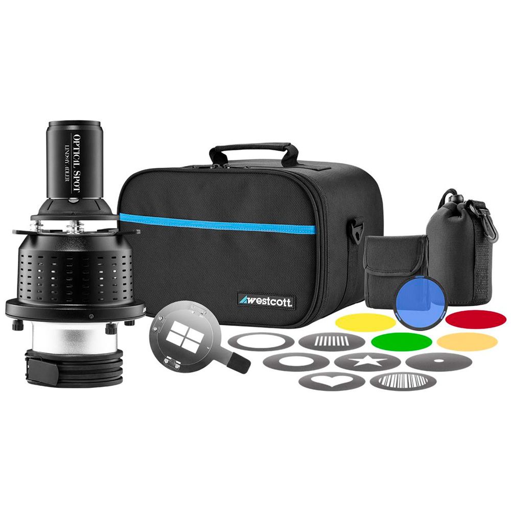 The Westcott Optical Spot and included accessories, designed by Lindsay Adler, are ideal for creating selective lighting, dramatic special effects, subtle textures, and creative patterns on any subject, surface, or background with precise focusing and control.