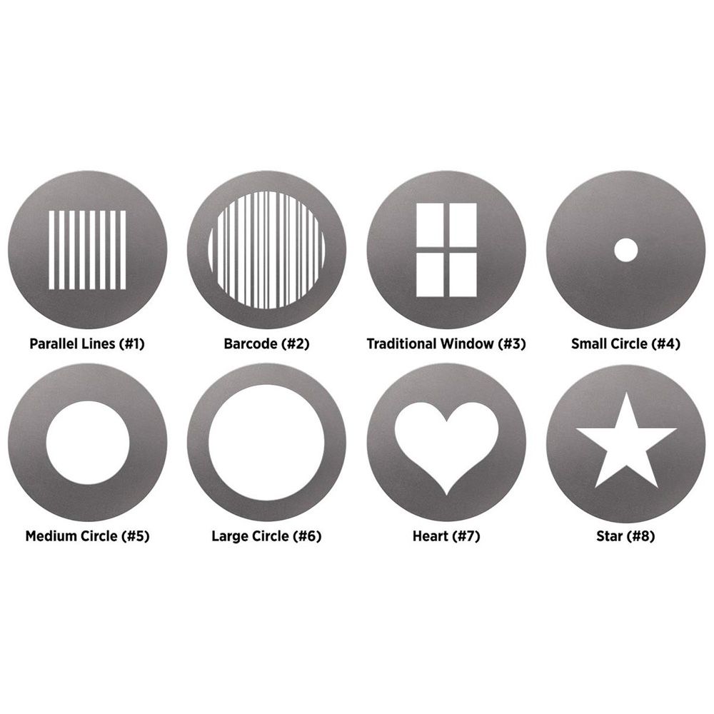 Create subtle or dramatic effects with the 8 gobo designs that project focusable images or patterns of light onto a surface or subject. Combine with a gel filter for adding color to your scene or model. Extension packs are available with a variety of gobos patterns and color gels options.