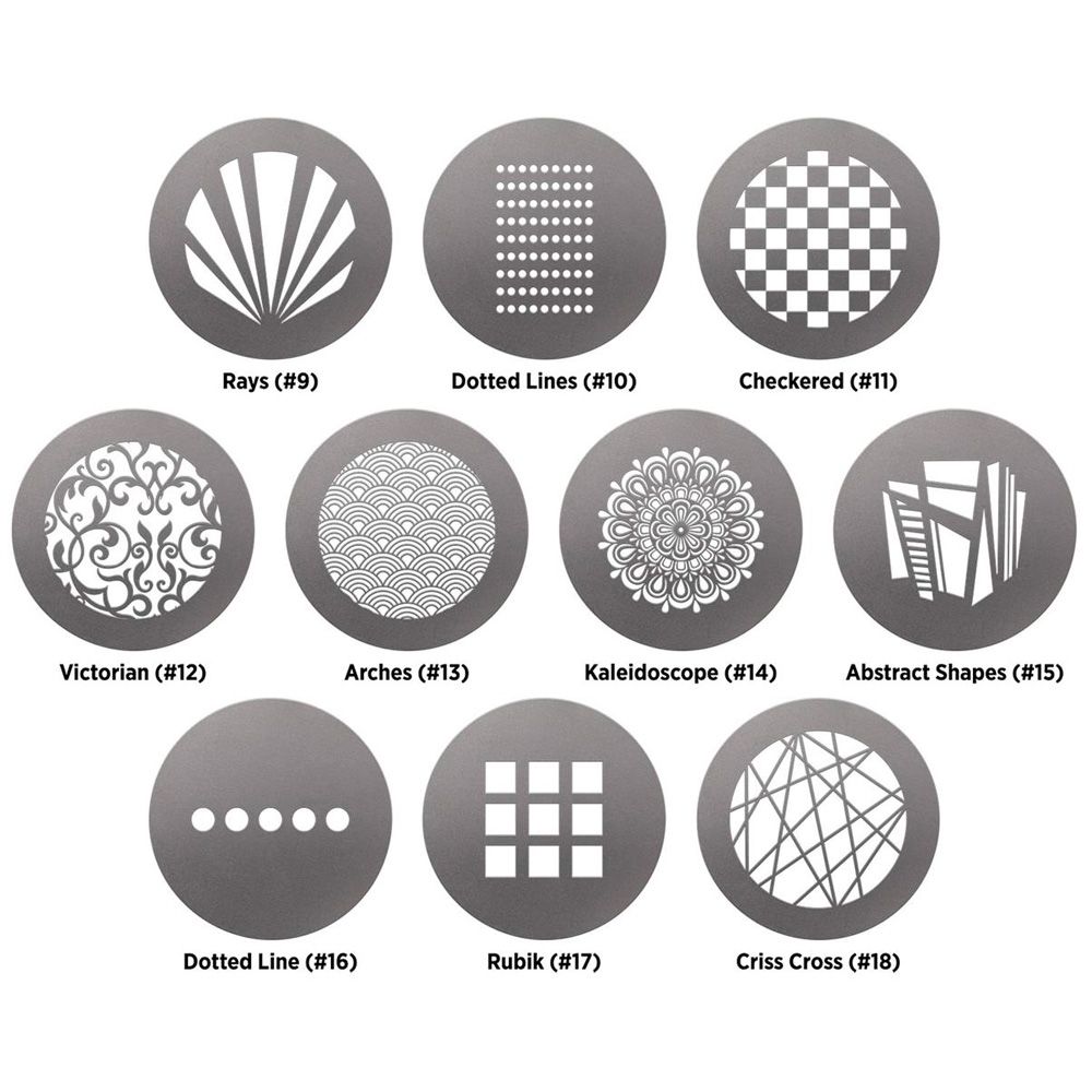 Designed by Lindsay Adler, this 10-pack of pattern gobos pairs with the Westcott Optical Spot for projecting focusable images or shapes of light onto any surface or subject. These 2.6" (6.6cm) metal discs with pattern cutouts are ideal for creating, dramatic special effects, subtle textures, and creative patterns with precise focusing and control.