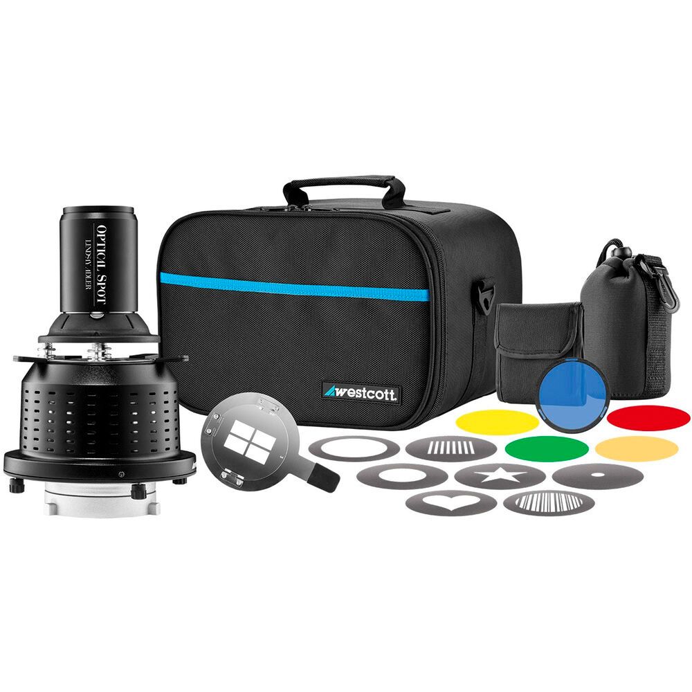 The Westcott Optical Spot and included accessories, designed by Lindsay Adler, are ideal for creating selective lighting, dramatic special effects, subtle textures, and creative patterns on any subject, surface, or background with precise focusing and control.