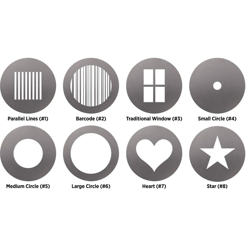 Create subtle or dramatic effects with the 8 gobo designs that project focusable images or patterns of light onto a surface or subject. Combine with a gel filter for adding color to your scene or model. Extension packs are available with a variety of gobos patterns and color gels options.