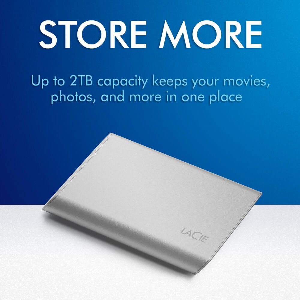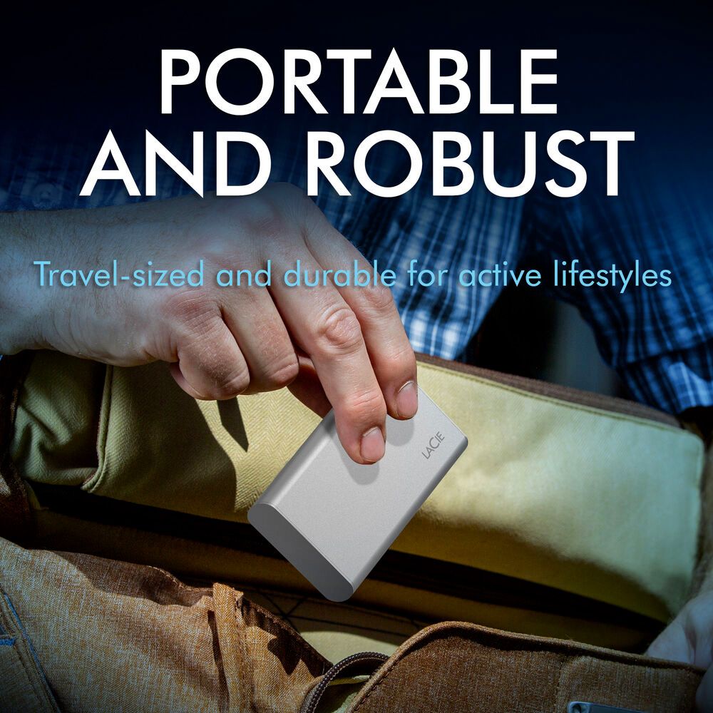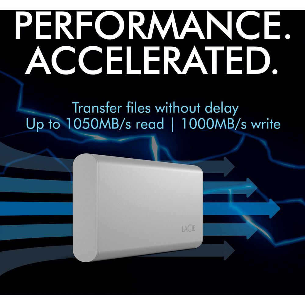 Enhance your workflow by carrying the 1TB Portable USB 3.1 Gen 2 Type-C External SSD v2 with you while traveling. This compact yet durable portable 1TB NVMe solid-state drive connects to USB 3.2 Gen 2 Type-C compatible devices such as Macs, Windows computers, and iPad Pros using the included cable to quickly transfer 4K videos, RAW photos, and other large files at up to 1030 MB/s. You can even run applications directly from the Portable SSD v2 to save space on your local drive. Featuring a durable metal casing and no moving internal parts, this external drive is designed to withstand drops of up to 6.5 feet. A one-month subscription to the Adobe Creative Cloud All Apps plan is included, which includes applications such as Photoshop, Premiere Pro, and Illustrator. For added peace-of-mind, the LaCie Portable SSD v2 has a 3-year warranty that also includes the Rescue data recovery service.