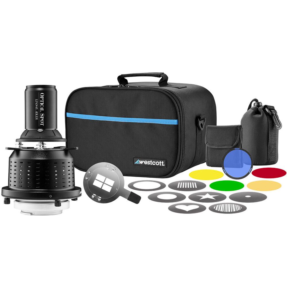 - Includes optical spot, 150mm f/3.5 focusing lens, 8 gobos, gobo holder, gobo storage case, 5 colour gels, gel ring clip, light mount, and travel case