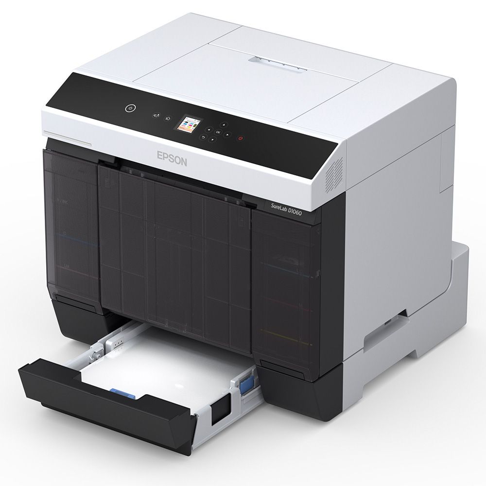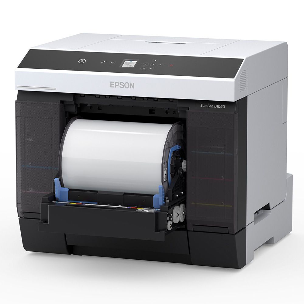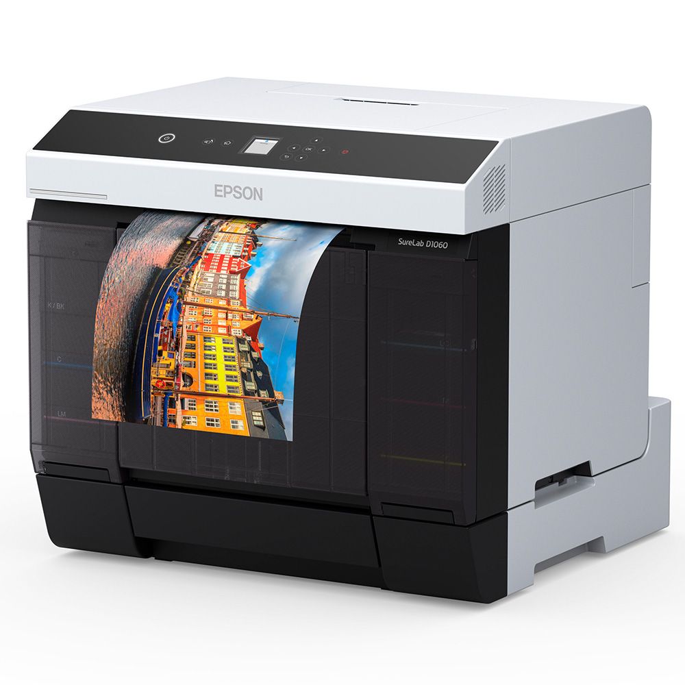 The SL-D1060 Dry-film Minilab is designed for low-medium volume production. It can be operated as a standalone machine or in multiples for heightened production. It incorporates a high precision Epson Micro Piezo™ Thin Film Print™ (TFP) head that enables accurate and consistent output in resolutions up to 1440 x 720 dpi. It features an upgraded 6-colour ink set that is applied using Variable Sized Droplet Technology (VSDT), for outstanding image quality with an enhanced gamut and dMax. Staying true to the SureLab series, the D1060 is compact, lightweight, and requires minimal operational space. It can produce up to 460 4x6" borderless prints per hour, using cost-effective sheet and roll-based media that comes in sizes ranging between 3.5" to A4, with a variety of surface finishes. The printer ships with a powerful Windows® and Macintosh® OS driver to enable operation, with standard photo and graphic software. It can also be used with optional Epson Order Controller to provide a full production system complete with costing, image editing, job scheduling, and load balancing.