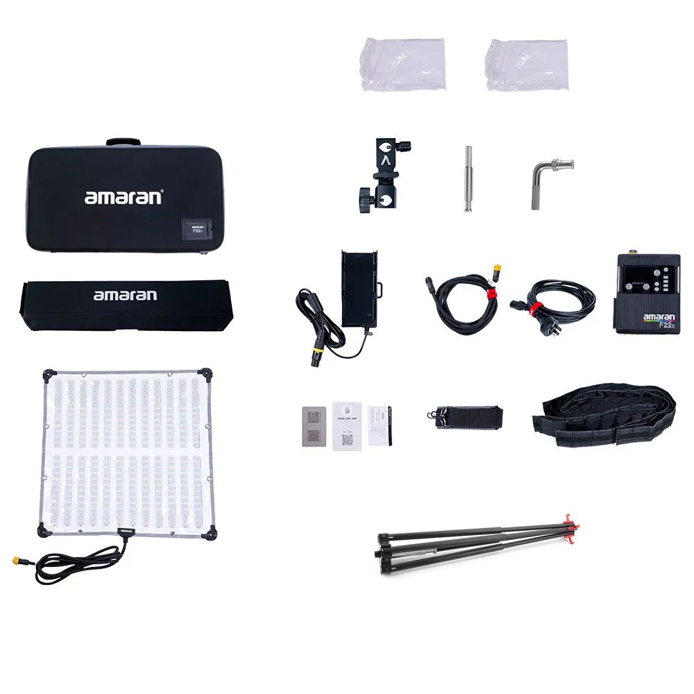 The F22c RGBWW LED Mat is a powerful, versatile, and flexible LED mat that measures 60x60cm. It offers outstanding light output and colour rendering suitable for a variety of users, from filmmakers to videographers, content creators, and still photographers. Providing 200W of power, it features RGBWW LEDs for complete colour control, as well as tunable CCT from 2500K to 7500K, providing endless possibilities for creative lighting selections through 360° HSI control, 46 colour gel presets, and 15 unique customizable lighting effects. It has stellar CRI and TLCI scores of 95+ and 97+, and stepless dimming from 0 to 100%. An included folding X-frame stretches the mat to a rigid panel that can be attached directly to a C-stand grip head using the straight Baby Pin adapter, or onto any standard light stand with the included right-angle Baby Pin and tilting stand mount. The included foldable softbox has two strengths of diffusion and a fabric grid that uses an integrated hook-and-loop fabric to instantly turn this flexible mat into an ultrathin soft light that will add a beautifully controlled soft light to a scene.