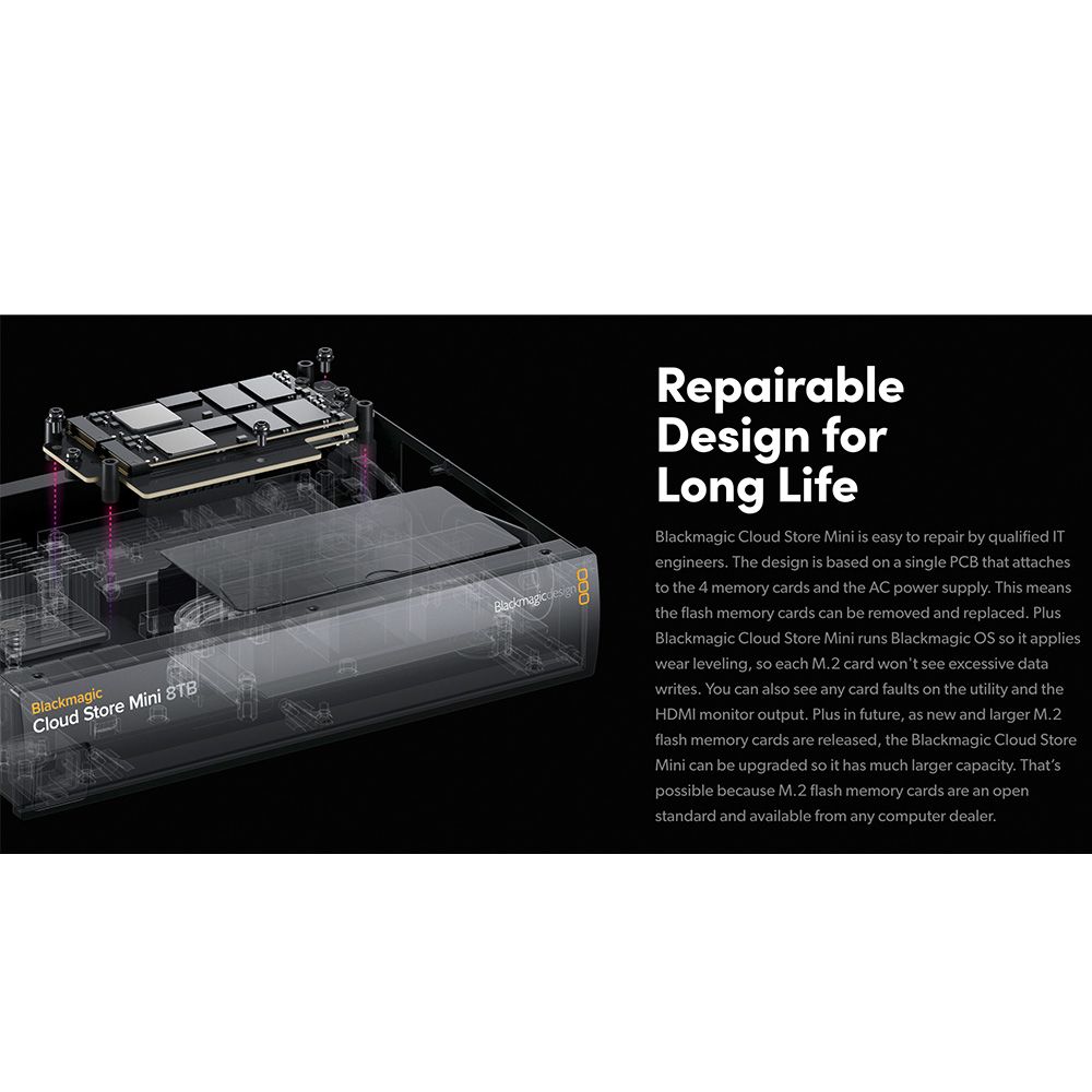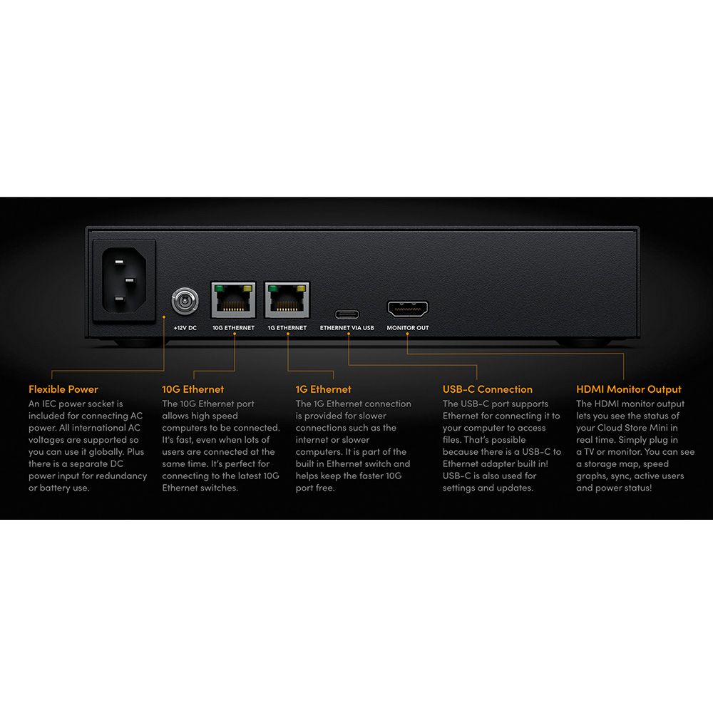 The Blackmagic Design Cloud Store Mini 8TB is a fast network storage solution in a compact rack-mount design. It features a high speed 10G Ethernet connection and four internal M.2 flash memory cards operating in parallel RAID 0 for extremely fast file access. The Blackmagic Cloud Store Mini is fast and can handle lots of simultaneous users all accessing files at the same time with ease. With Dropbox live sync, files can be distributed between multiple units globally, for very fast local file access, even on lower-cost internet connections. There's also an HDMI monitor output making it easy to monitor files stored on the network.