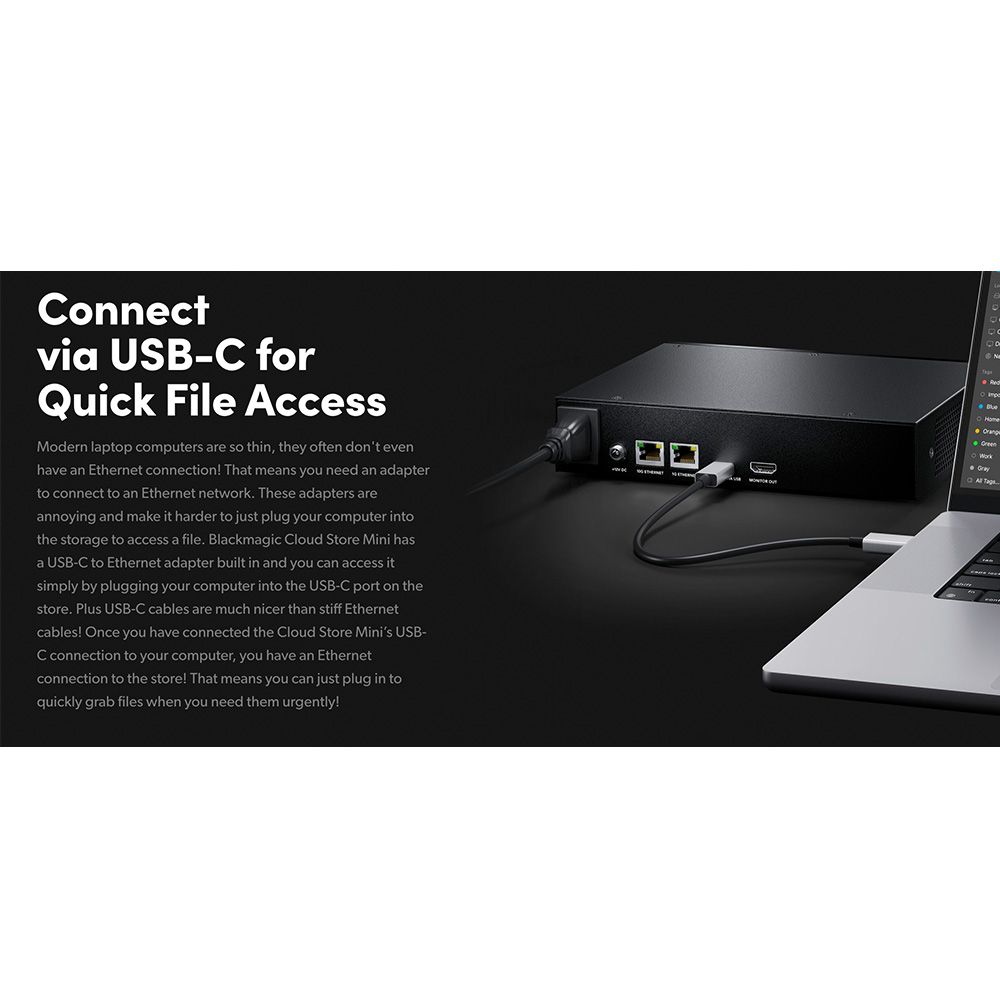 Modern laptop computers are so thin, that they often don't even have an Ethernet connection. Blackmagic Cloud Store Mini has a USB-C to Ethernet adapter built-in and customers can access it simply by plugging their computer into the USB-C port on the store. Once customers have connected the Cloud Store Mini’s USB-C connection to their computer, customers have an Ethernet connection to the store. That means customers can just plug in to quickly grab files when customers need them urgently.