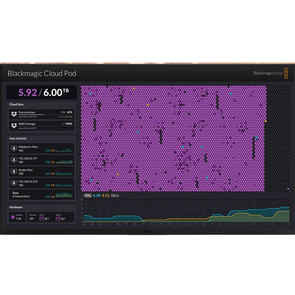 The most exciting feature is the HDMI monitoring output. Simply connect a TV or computer monitor to get a live status of the Blackmagic Cloud Store Mini. The storage map shows a graphic representation of the memory core and real-time read and write access happening for the connected users. There are also graphs that show customers the data transfers on the Ethernet connections. The status for each Dropbox connection is also shown. It's even possible to see connected users and the power supply status.