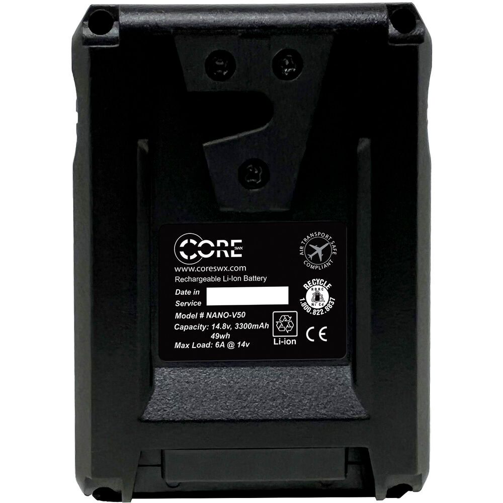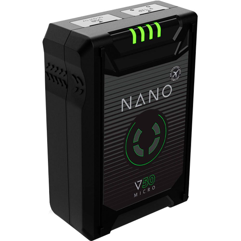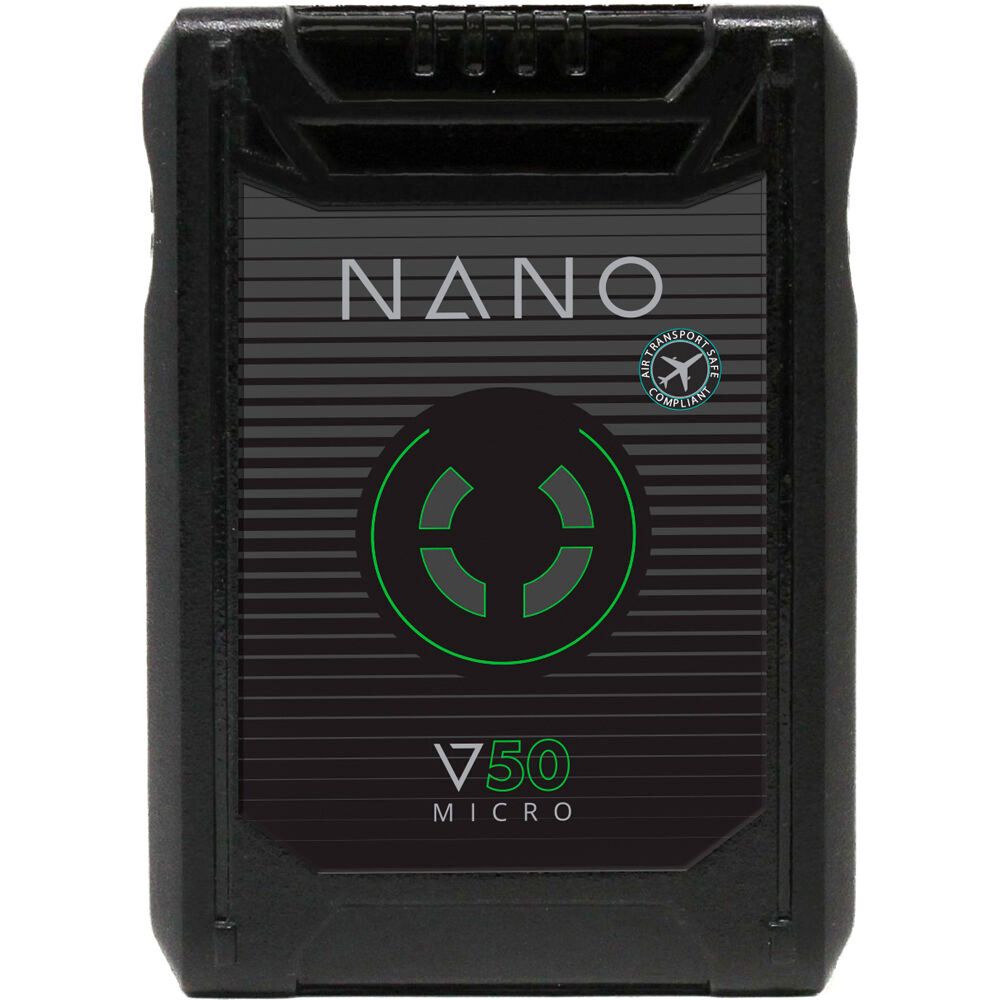 Ultracompact, yet powerful, and ideal for devices from cameras to monitors, the V-mount NANO Micro 50 Lithium-Ion Battery powers your gear while keeping the weight to a minimum. The battery features 14.8V output to power your professional devices, and it supports up to 6A continuous draw.