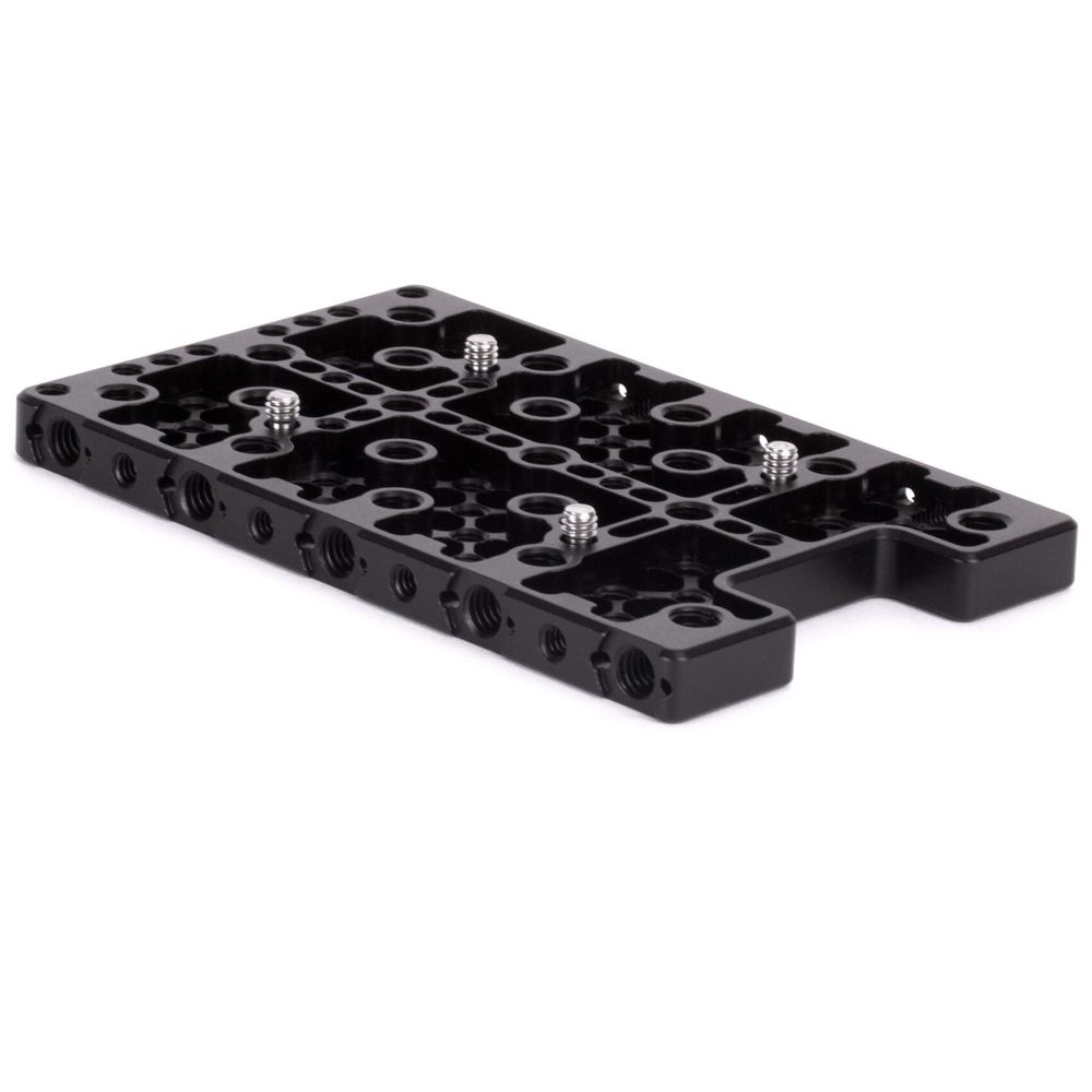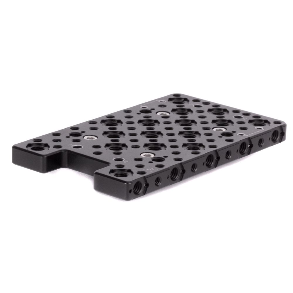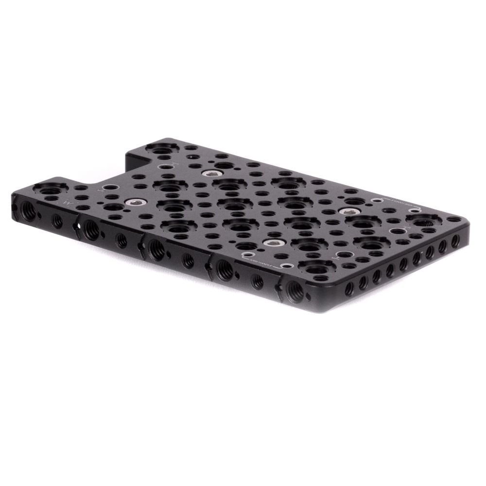 Top Plate (Sony Venice) is a top cheeseplate for the Sony Venice that contours to the shape of the camera body and leaves the USB port area open. Plate provides rows of 1/4-20 and 3/8-16 holes for attaching Handles, UVF Mount v2, Rod Clamps, and more. ARRI accessory mount also in several places (3/8-16 threaded hole with locating pins adjacent). Mounting holes available and marked for Master Top Handle and ARRI top handle (CCH-2).