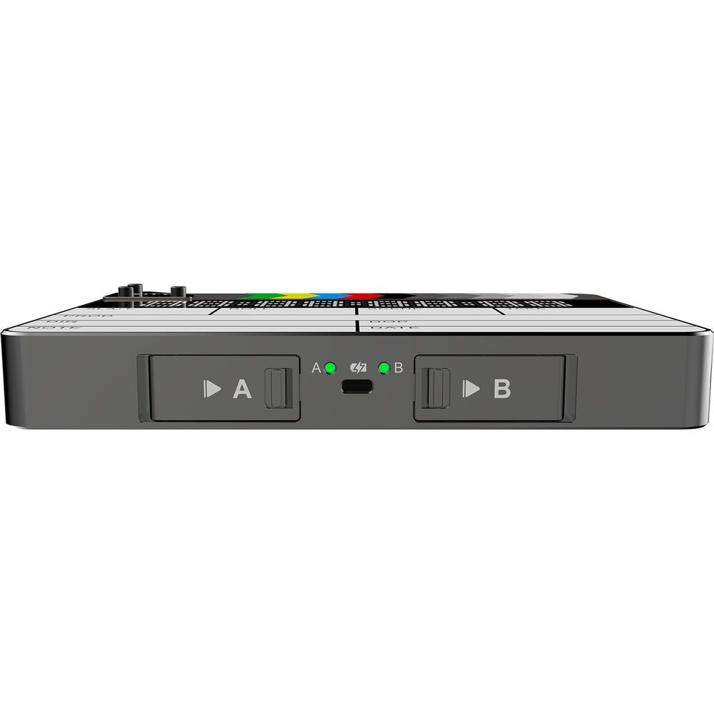 The timecode slate features dual NP-F battery bays. This allows you to hot-swap the two included NP-F550 rechargeable batteries (if you forget to charge them) without having to power down your smart slate. And best yet, you can take your digital slate and plug it into the included USB Type-C charger overnight to top off your current NP-F batteries.