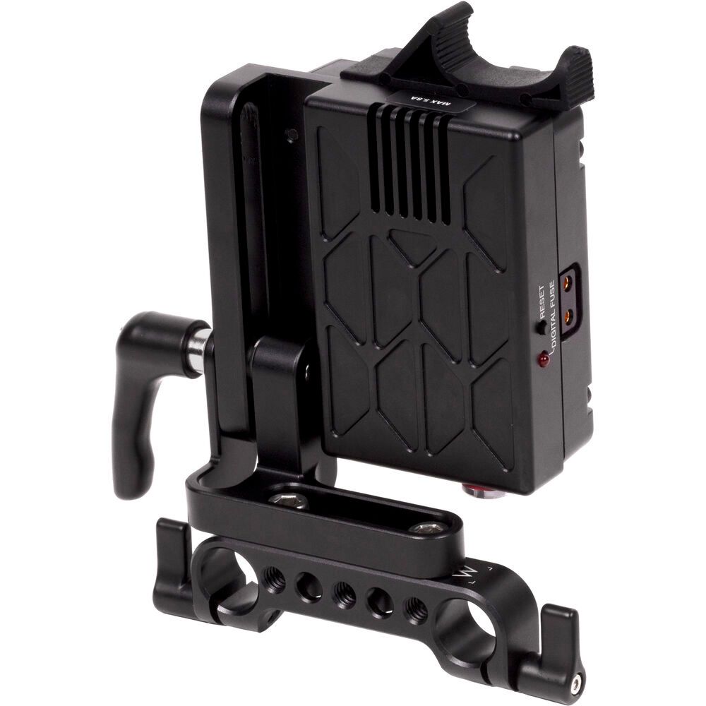 Micro Battery Slide Pro (V-Mount) utilizes an Anton/Bauer micro battery plate which provides unregulated 12v to a 3pin connector for camera power. The plate attaches to two 15mm LW rods via integrated 15mm LW Rod Clamp and position can be adjusted along the battery slide.