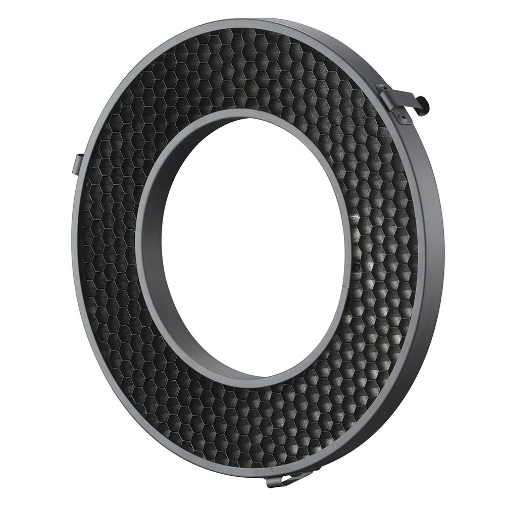 Featuring aluminum construction, the 40° Honeycomb Grid for R200 Ring Flash Head Body from Godox narrows the head's wide beam spread, eliminates spill light, and provides the directional control necessary for selective lighting.
