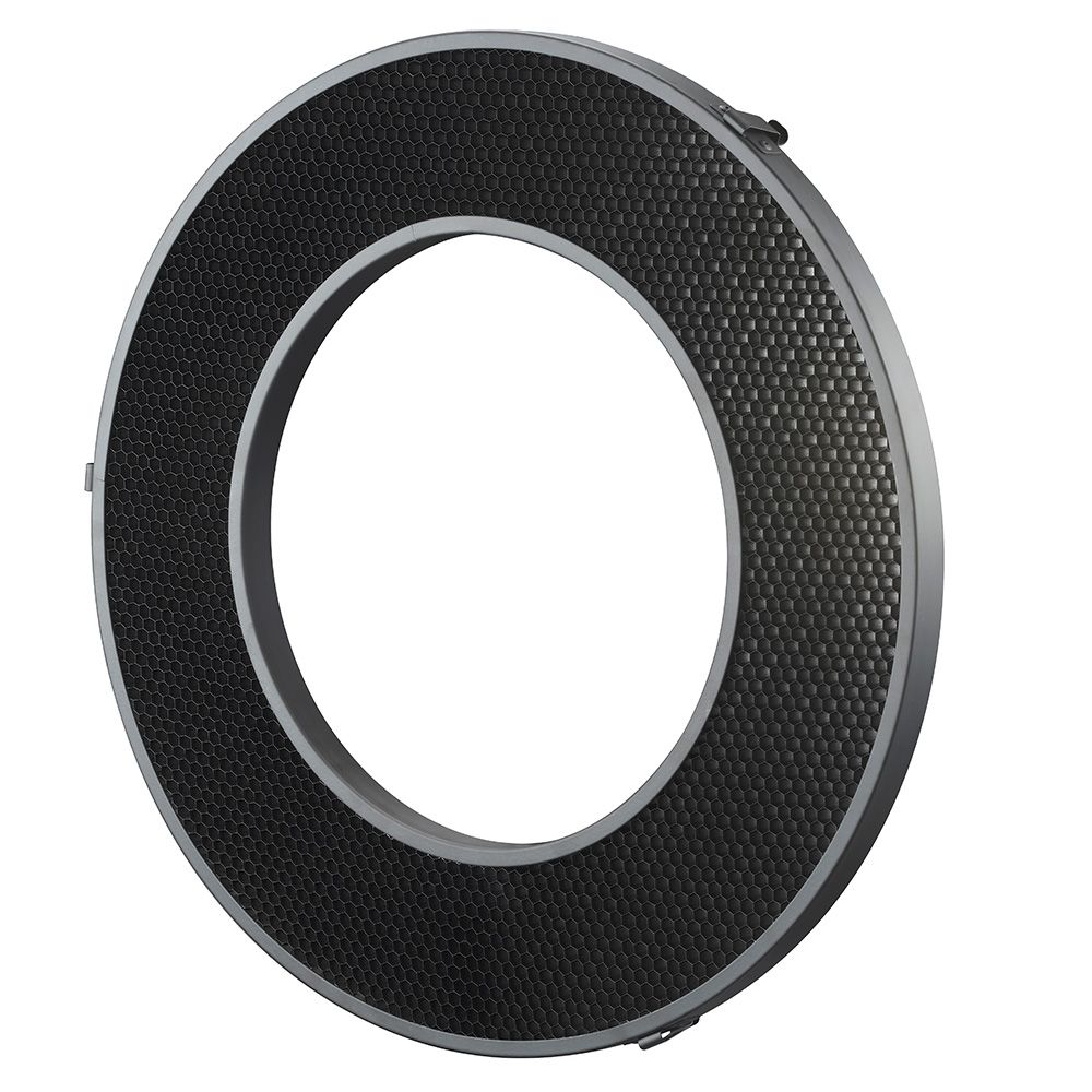 Featuring aluminum construction, the 30° Honeycomb Grid for R200 Ring Flash Head Reflector from Godox narrows the head's wide beam spread, eliminates spill light, and provides the directional control necessary for selective lighting.