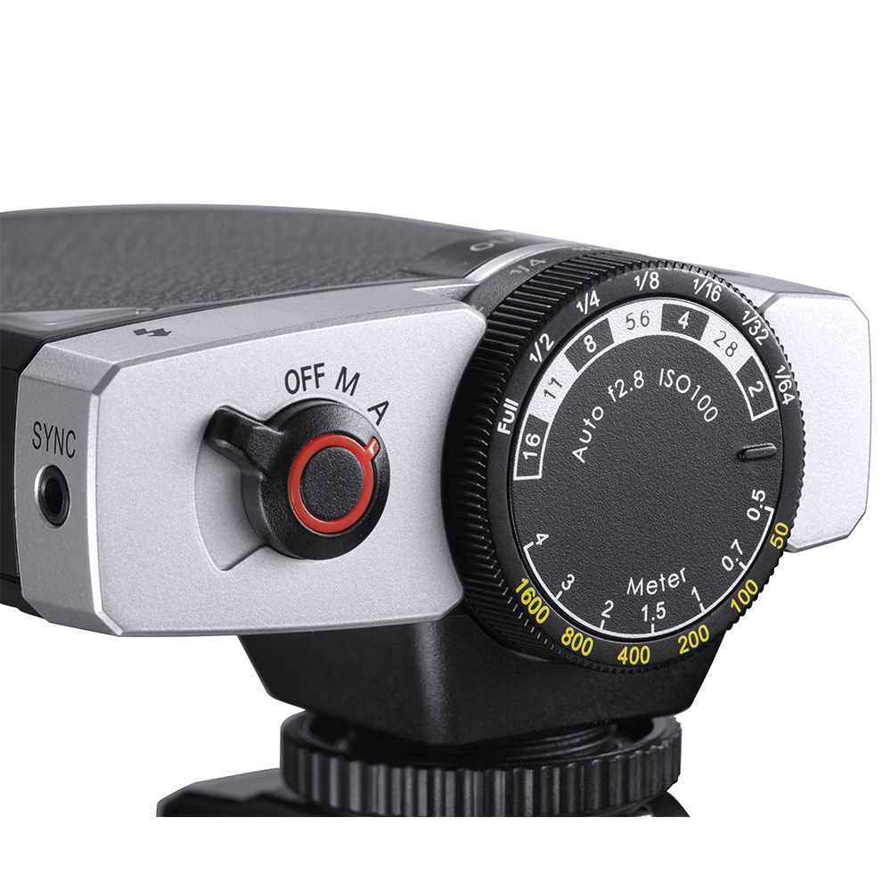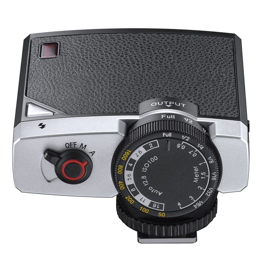 Called a "retro" flash, the unit has a simple dial that correlates ISO with apertures, power levels, and shooting distances. For example, if you want to shoot at 5' with an ISO of 400, the dial lines up f/4 and 1/8 power. The flash has an Auto Mode, too, that defaults to f/2.8 at ISO 100.