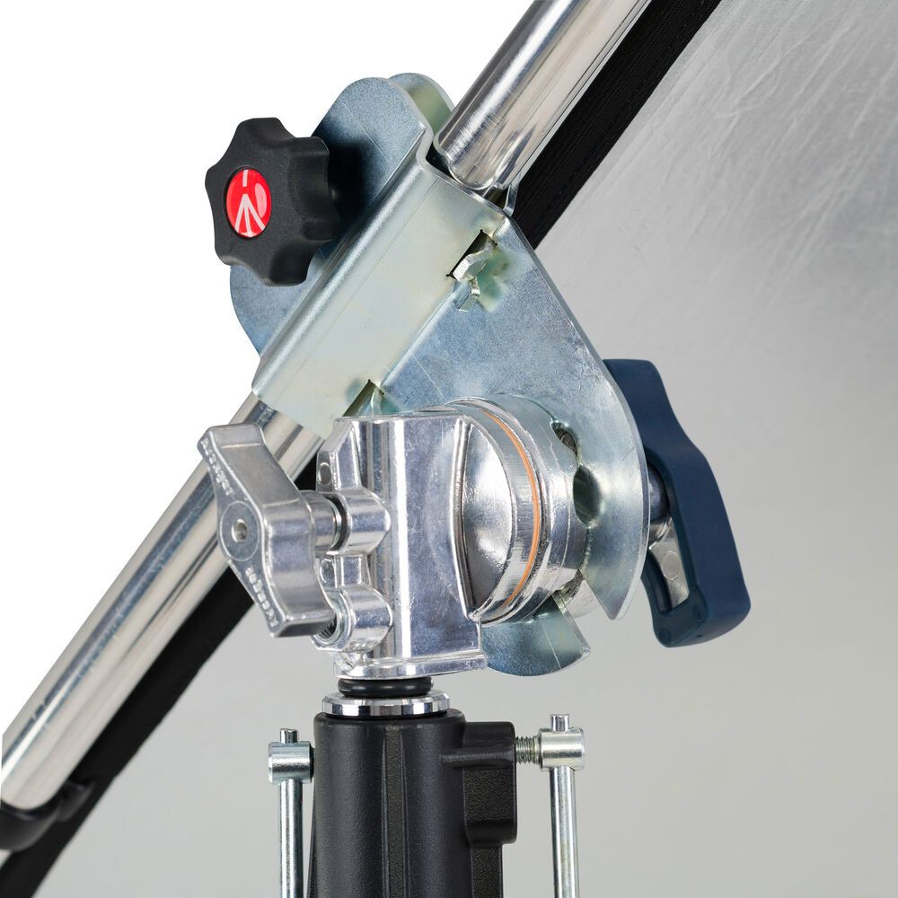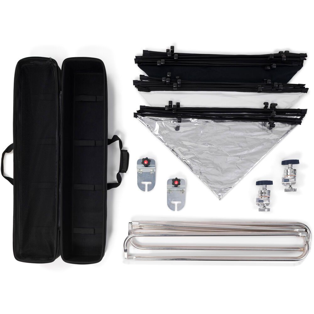 Included are three fabrics, each of which quickly clips onto the frame and just as quickly unclips when you want to swap it out for another fabric. The black fabric absorbs light from the subject and can be used to create a light-to-dark ratio in flat light conditions, block window light or other illumination, or reduce reflections on shiny or mirrored surfaces. The reversible silver/white fabric has a dual purpose. The silver side offers highly reflective light quality great for long-throw work and renders a snappy, high-contrast look with a cool colour bias, while the white surface provides neutral reflectance with a soft quality of light. Finally, the 1.25-stop diffusion fabric both reduces the amount of light falling on the subject and is also a valuable tool when used overhead to tame bright, contrasting light sources such as the sun. What about mounting? This is a complete kit so Manfrotto has you covered. The kit provides two ears - flat, notched metal plates that fasten anywhere on the tubular frame. The ears slip into the two provided grip heads, each of which has 5/8" receivers. Add two stands and you have a solid setup for an overhead or butterfly. The whole kit fits in the included rigid case.