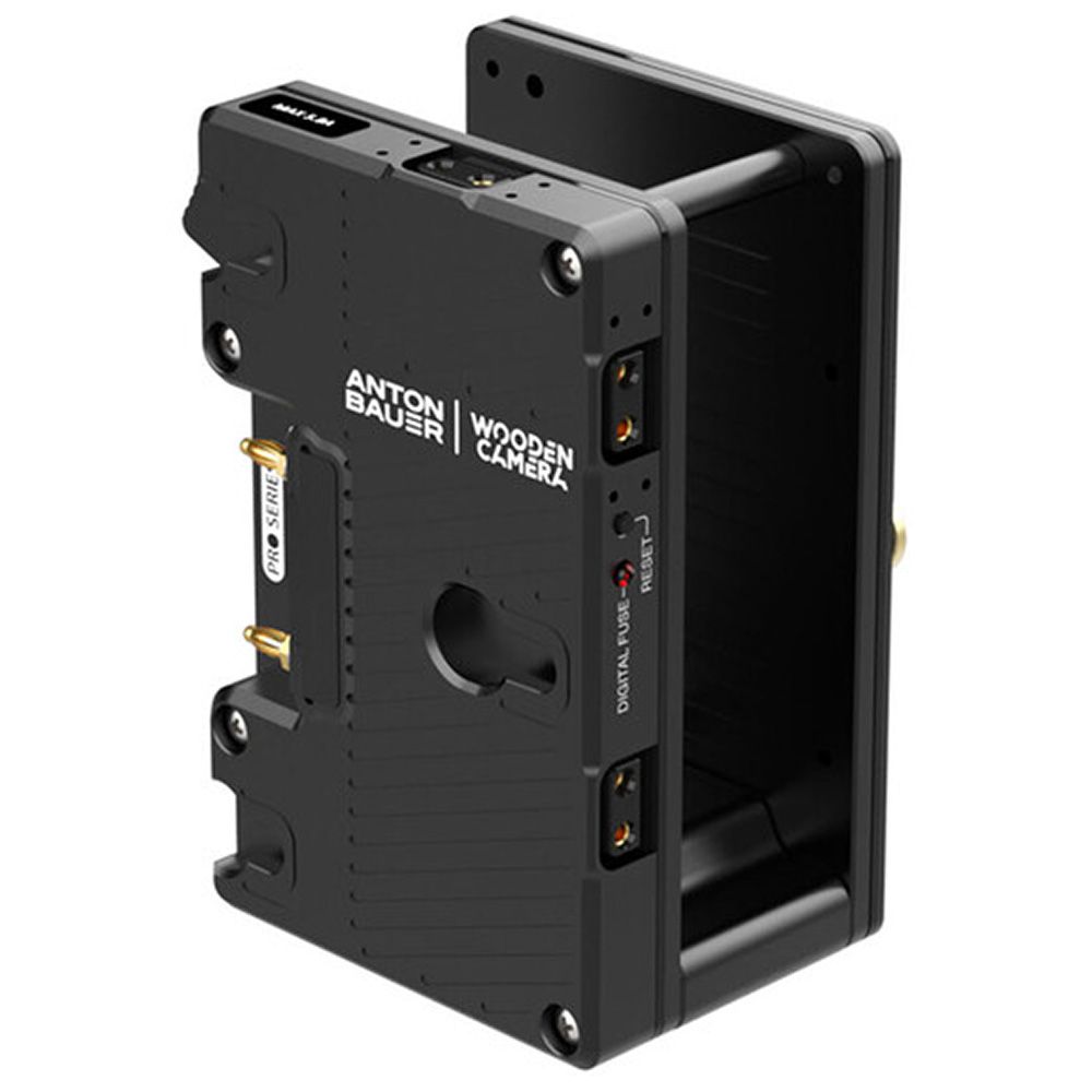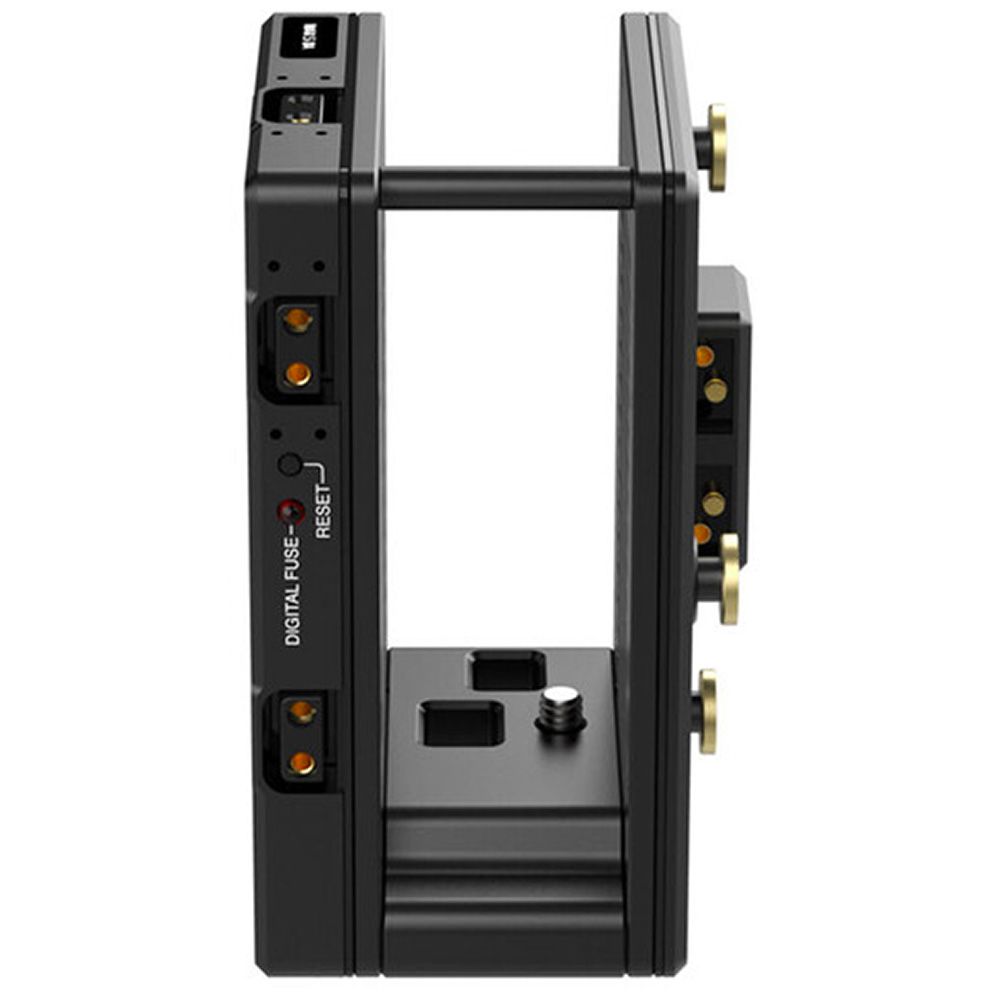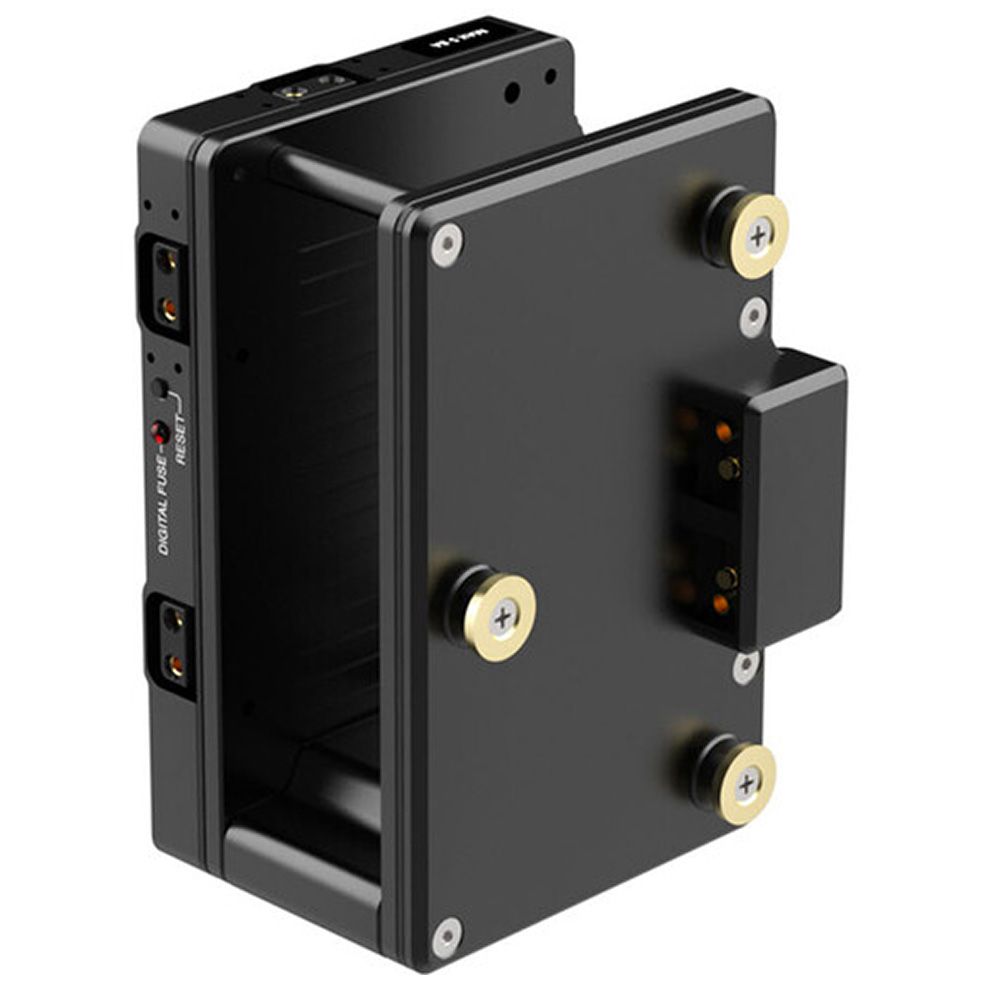 Rear (battery-side) battery plate features 3x D-Taps for accessory power at battery voltage (12-16V) and a digital fuse with reset button. Should the user exceed the set current for accessories, only the accessory outputs are disabled leaving the camera running normally. Once the current load has been reduced by either removing accessories or reconfiguring, the reset button can be pressed to enable accessory power again.
