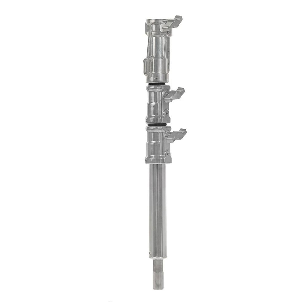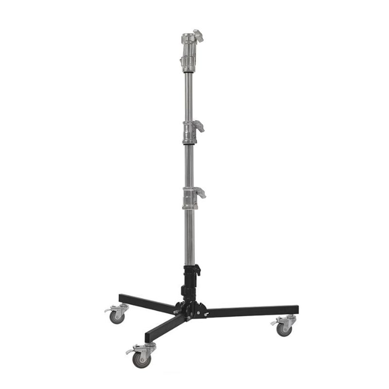 The Xlite Junior Roller Low Boy combo stand with 3 sections and 2 risers, features a lower steel column and 2 risers in Aluminium. This stand has a folding wheel base and when the stand is retracted and the wheels are folded it is only 68 cm long. Capable of holding loads up to 25 kg this rolling braked base stand is great for holding monitors and is very popular for people when shooting tethered. The combo head has a 28 mm/ 1 1/8 in receiver and a retractable 16 mm/ 5/8 in baby pin. The low folding wheel base allows you to get this stand under objects that are not very far off the ground. Easily nestles under c-stands too! The max height of 135cm and min height of 35cm in is ideal for working while standing or sitting.