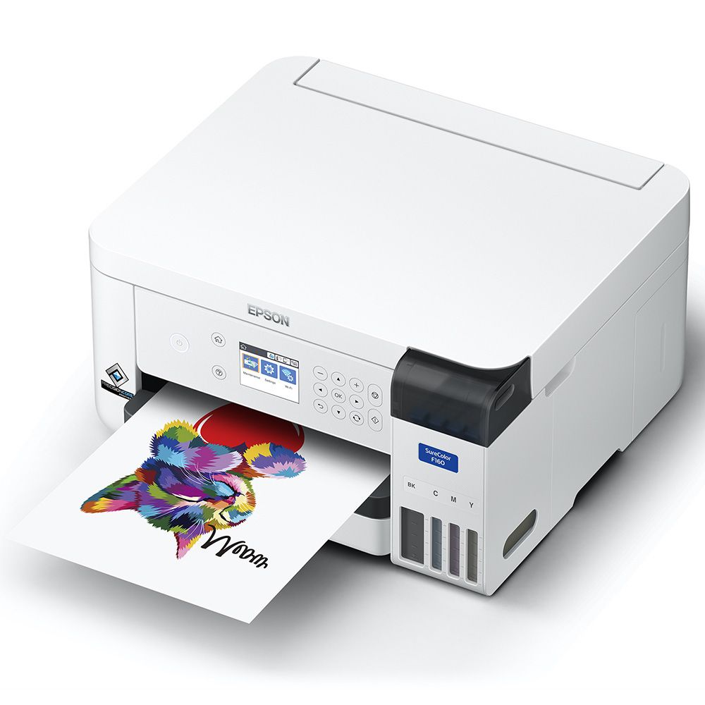 The SureColor F160 uses inexpensive ink and A4 sheet-based media. Ink ships in bottles and is loaded into a small tank system while paper is loaded via a tray. It features the latest Epson print head and image processing technology that work together with the ink to enable high quality imaging with fine gradation and a wide gamut. It is easy to operate and prints quickly. Output can be sublimated onto polyester fabric and substrates that will accept a polyester coating and have moderate heat tolerance. The printer can be used with a variety of low-cost 3rd party heat presses.