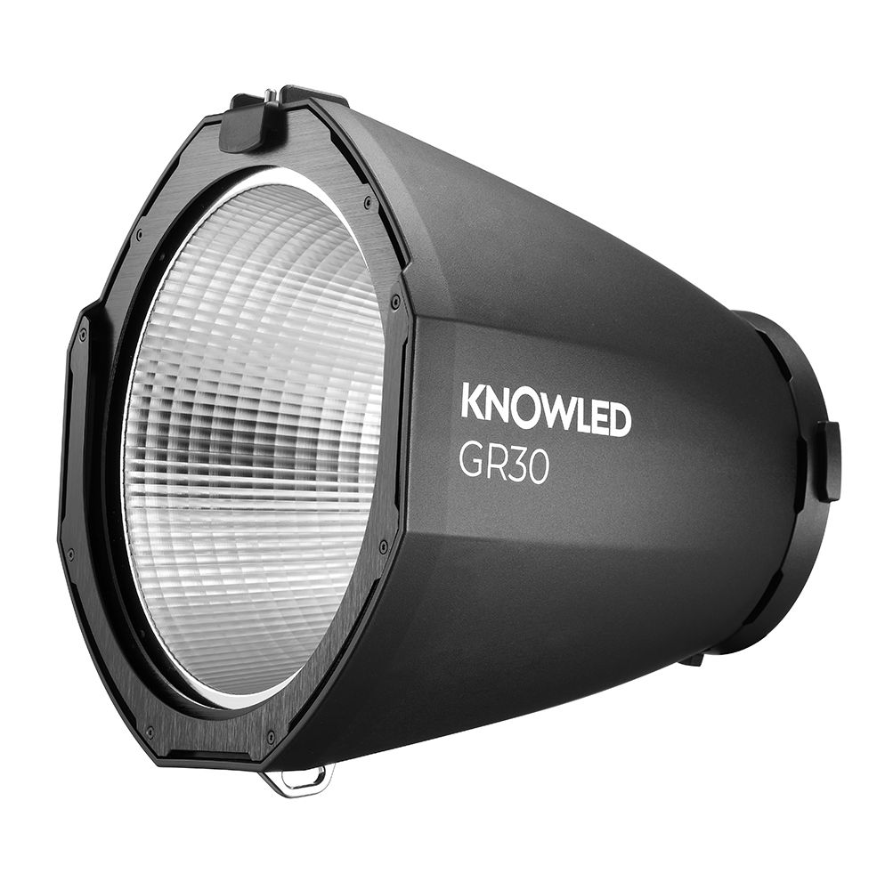 The Reflector for KNOWLED MG1200Bi & MG2400Bi LED Light from Godox mounts with a simple twist and reduces spill light as it shapes the angle of the beam spread. This 30° reflector yields a moderate spot output that's useful for larger subjects or for lighting a larger area of the set while still constraining the beam.