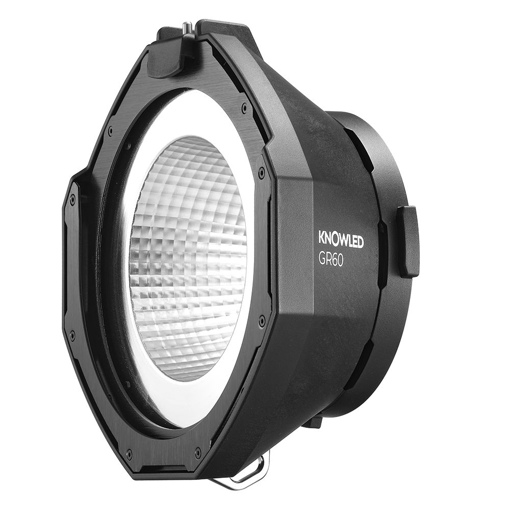 The Reflector for KNOWLED MG1200Bi & MG2400Bi LED Light from Godox mounts with a simple twist and reduces spill light as it shapes the angle of the beam spread. This 60° reflector yields a wide beam spread for larger areas of the set or for groups.