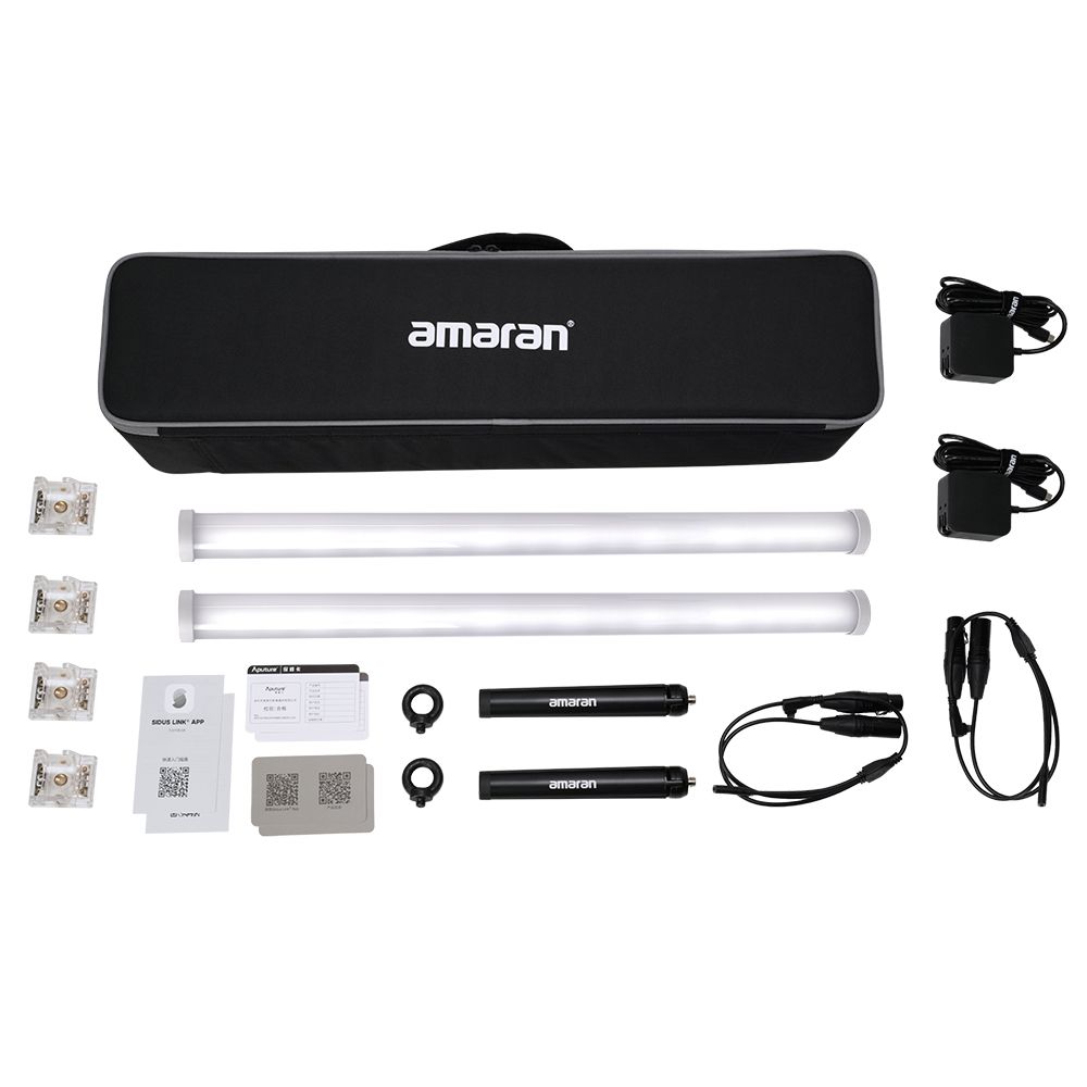 The amaran PT2c 2-Light Production Kit includes two 2-foot battery- powered pixel tubes that are part of amaran’s first-ever full-color LED pixel tube series. The Pixel Tube series is comprised of a family of 1-foot, 2-foot, and 4-foot lengths – all featuring multiple Pixel FX, RGBWW color quality, Sidus Link app & DMX control, and USB-C rechargeable batteries packed into their sleek & slender form factor. The 2-Light Production Kit expands this mid-sized multitool’s capabilities, with not only twice the available light, but also the inclusion of mini tripod floor stands and USB-C to DMX adapters to expand creativity and enhance functionality.