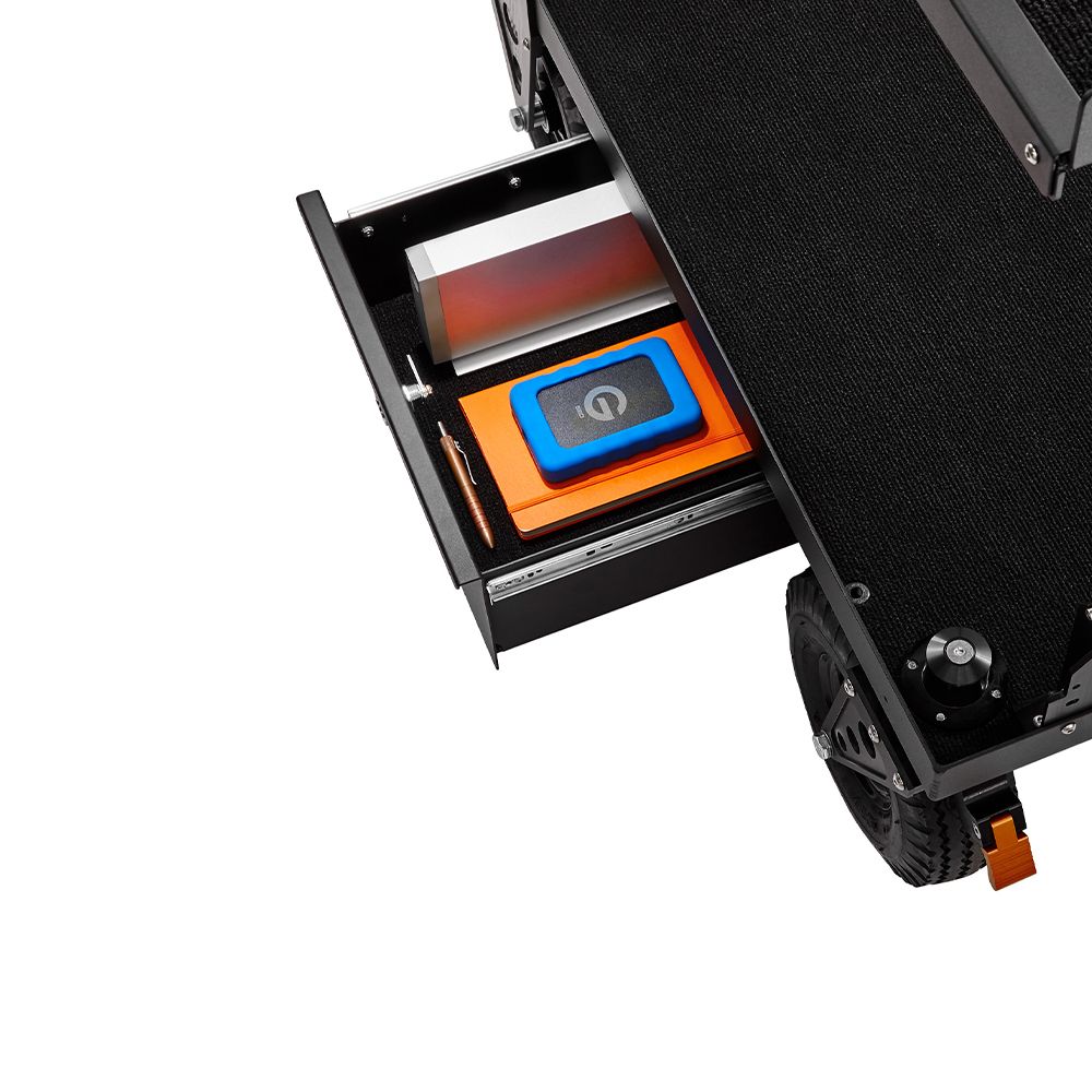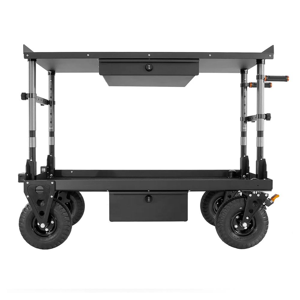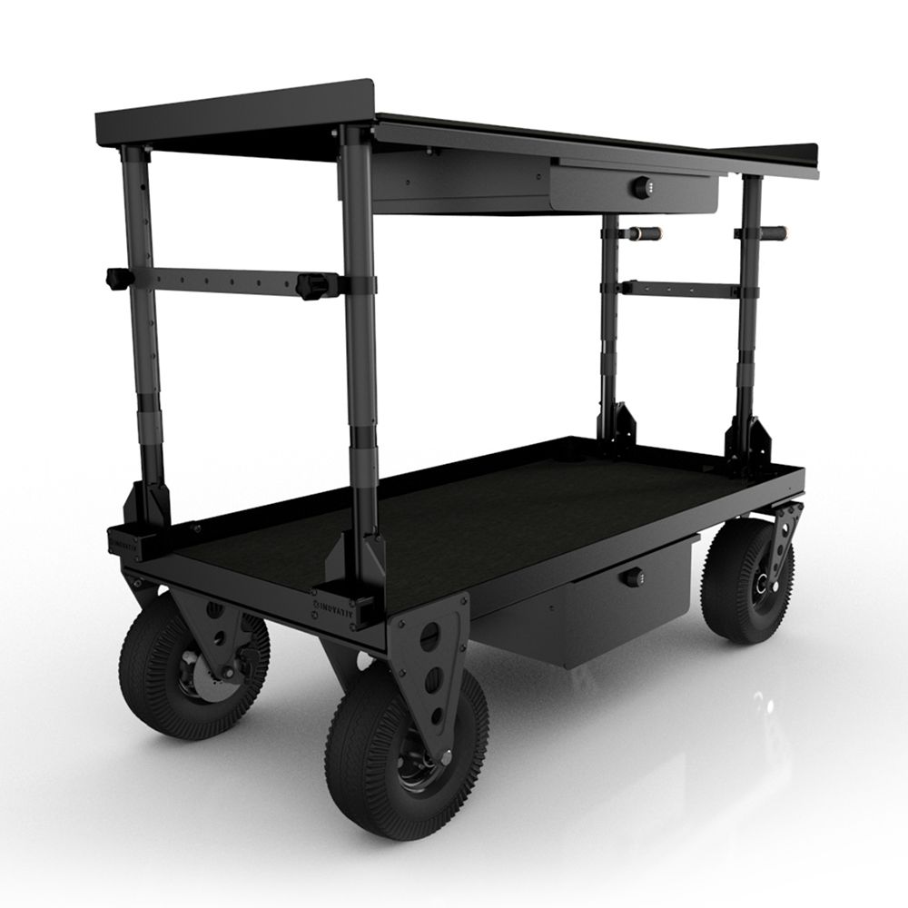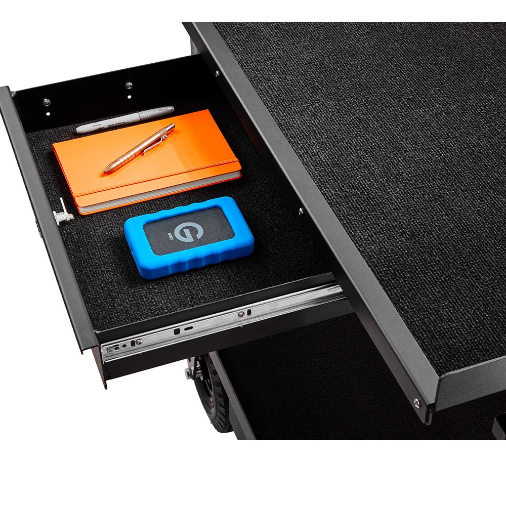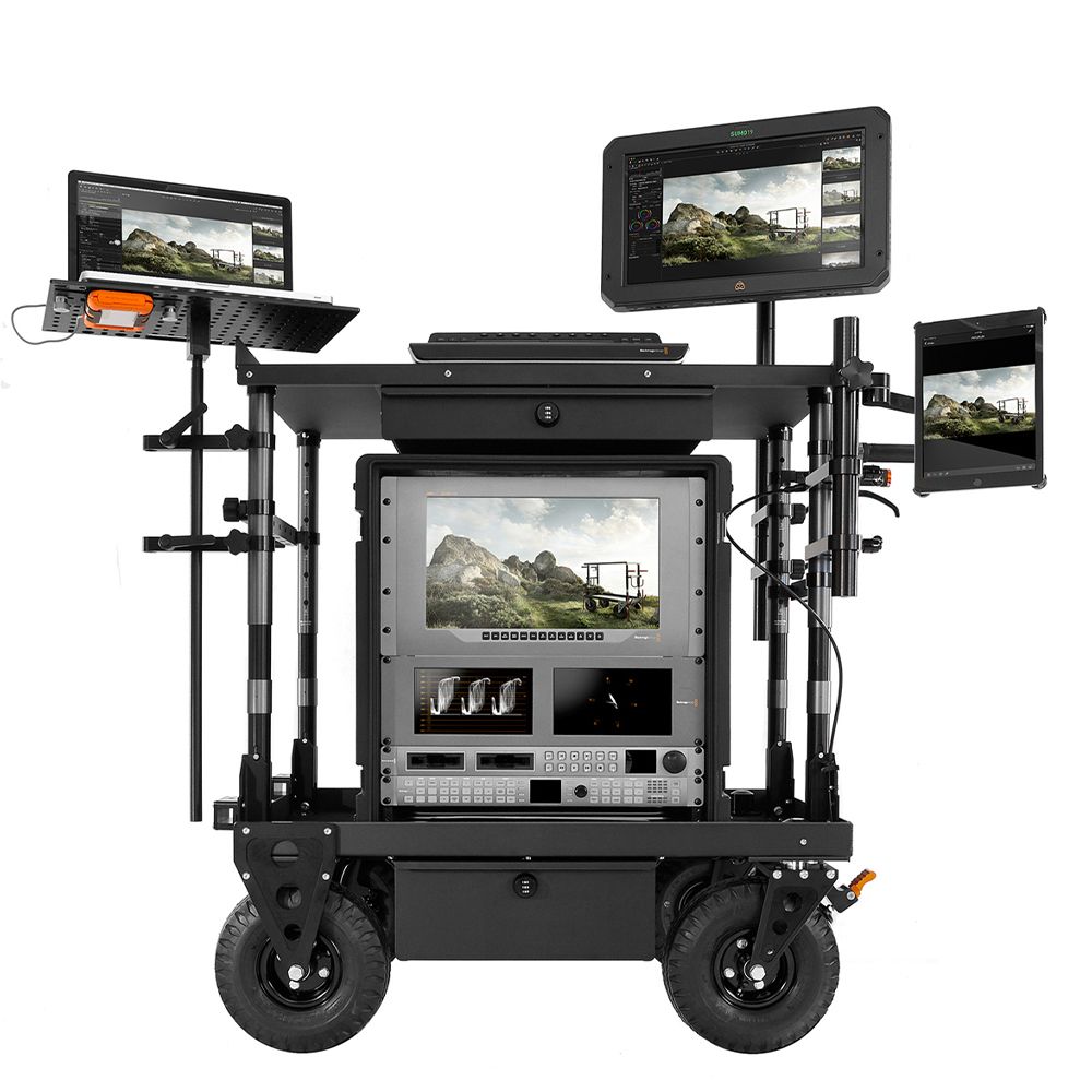 A computer workstation cart that is ideal for DITs, Digital Techs & Photographers. The Top Shelf has one side without a lip for utilising with a keyboard.