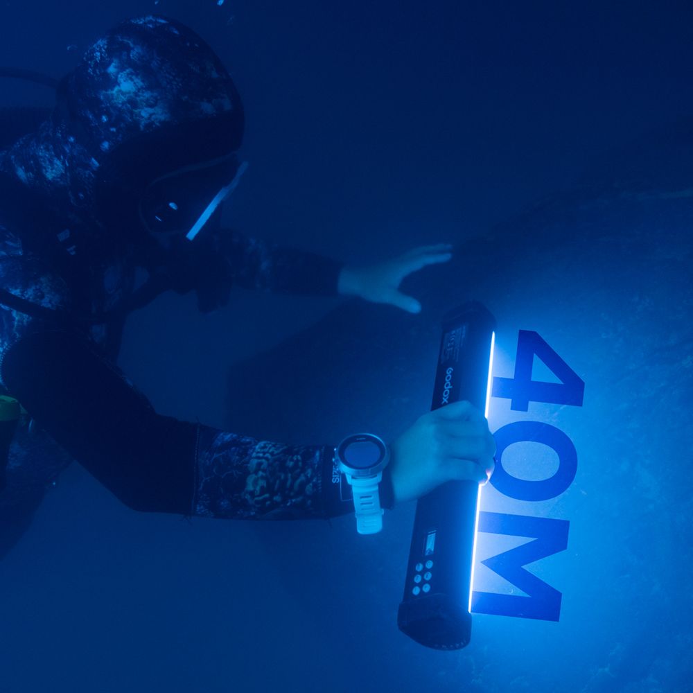 Designed to light up your underwater photo and video productions, the WT25D Daylight Dive Tube Light from Godox combines consistent performance and easy handling. This versatile 25cm tube-shaped light has a depth rating of 40m and provides illumination from multiple angles. When submerged, the 5600K CCT light automatically switches to higher power, outputting up to 570 lux at 1m. CRI/TLCI scores of 96 ensure color accuracy, and 13 preset special effects simulate a wide range of creative shooting scenes. Thanks to its fluorescent buttons, the light can operate in complete darkness to reveal the wonders of sea life. A runtime of up to 1 hour assures you will have a bright, diffused, and even light throughout your dive. A built-in OLED panel efficiently shows the light's battery level. A bag and a USB-C charging cable are included for convenience.