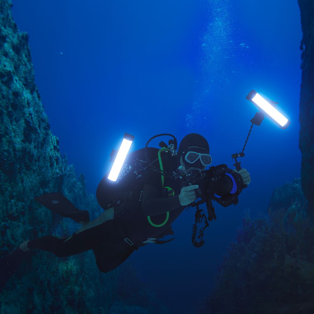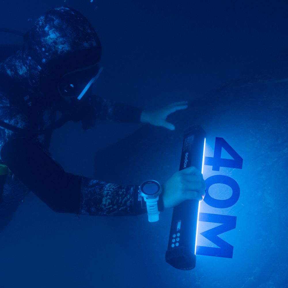 Designed to light up your underwater photo and video productions, the WT60D Daylight Dive Tube Light from Godox combines consistent performance and easy handling. This versatile 60cm tube-shaped light has a depth rating of 40m and provides illumination from multiple angles. When submerged, the 5600K CCT light automatically switches to higher power, outputting up to 1940 lux at 1m. CRI/TLCI scores of 96 ensure color accuracy, and 13 preset special effects simulate a wide range of creative shooting scenes. Thanks to its fluorescent buttons, the light can operate in complete darkness to reveal the wonders of sea life. A runtime of up to 2 hours assures you will have a bright, diffused, and even light throughout your dive. A built-in OLED panel efficiently shows the light's battery level. A bag and a power adapter are included for convenience.