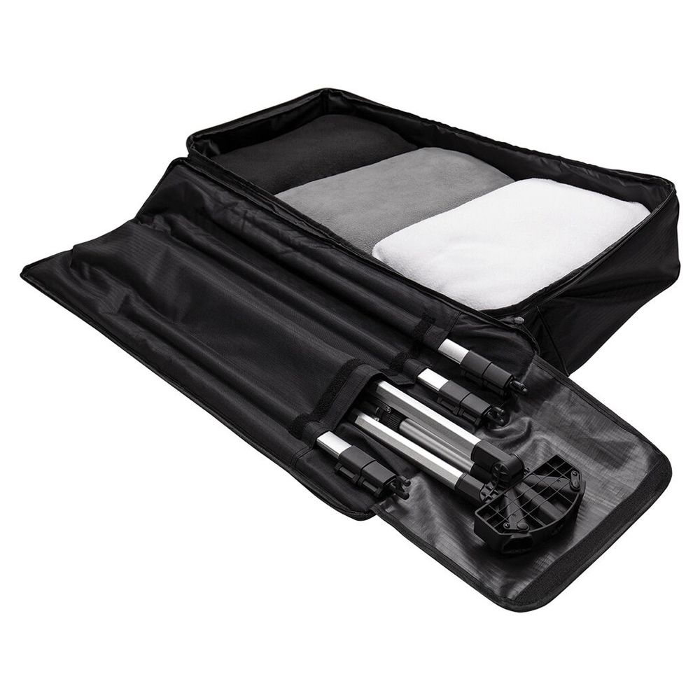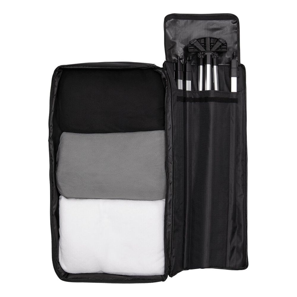 Achieve professional-looking images with this full size 2.4 x 2.4m X-Drop Pro 3-Pack Backdrop Kit from Westcott, a portable backdrop solution for photo and video work. The kit includes three wrinkle-resistant backdrops in high-key white, rich black, and neutral gray as well as an X-Drop Pro Backdrop Stand. Ideal for shooting small group portraits and video interviews, these solid color backdrops are easy to light and gel to alter their appearance. In addition, the wrinkle-resistant fabric material is machine washable and reflection-free. Attach the backdrop to the stand via the five built-in grommets and pull it taut for a smooth and seamless look whether you're shooting on location or in the studio.