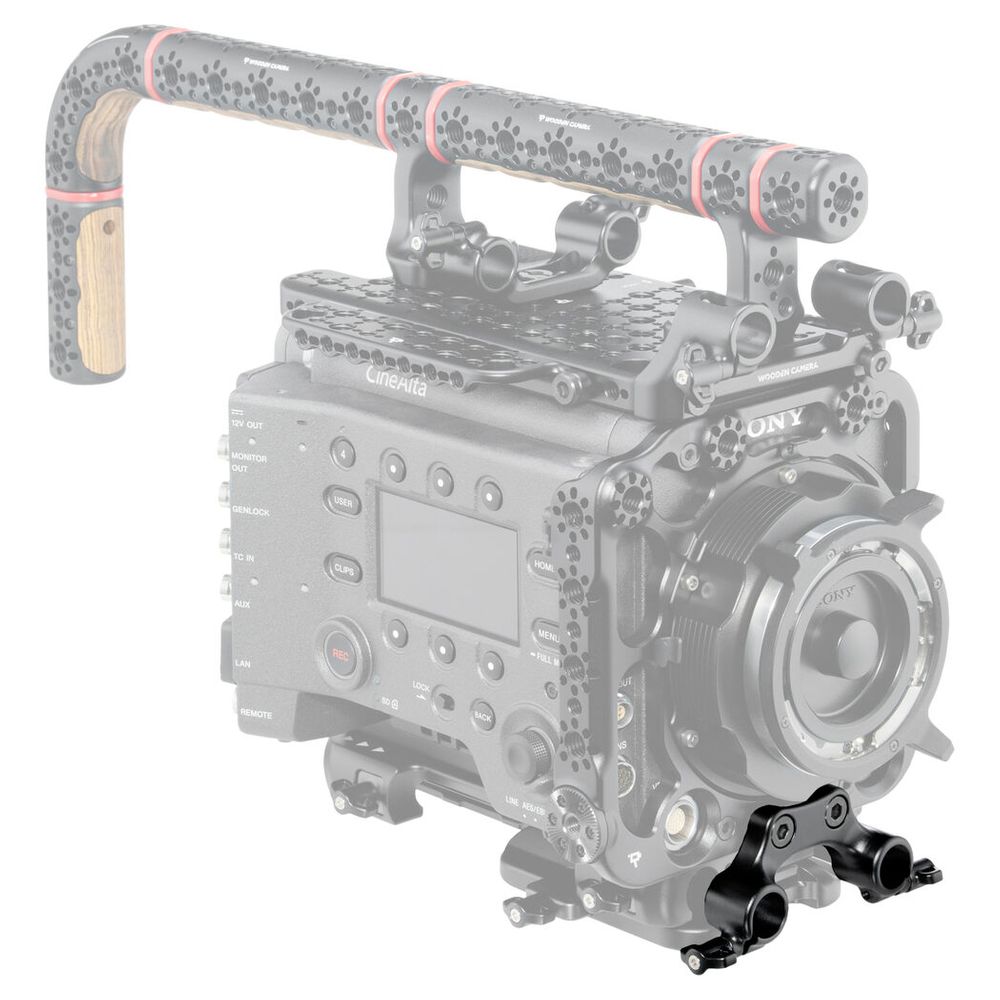 Integrate 15mm rods into your Wooden Camera Faceplate Cage System using this 15mm Dual Rod Clamp. The clamp mounts to two specific mounting points on the Faceplate Cage centered beneath the lens mount of your Sony VENICE series camera. This allows for the integration of rod-based lens accessories like follow focus systems or matte boxes with perfect placement.