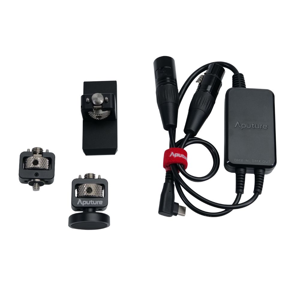 The Aputure Active USB Type-C to 5-Pin DMX In & Out Adapter Kit is a DMX adapter package that allows users to connect Aputure fixtures in series to a DMX network. Coming with the USB-C to DMX Adapter itself along with three mounting accessories, this kit will allow users to secure this adapter onto the fixture itself or to a variety of mounting points such as a Lightning Clamp. Compatible fixtures include the INFINIBARs, MT Pro, and MC Pro. Featuring a built in DMX/RDM chip, this adapter ensures stable DMX/RDM wired control of fixtures. In addition to offering wired DMX control, this adapter charges lights over USB-C while the light is wired into a DMX network.