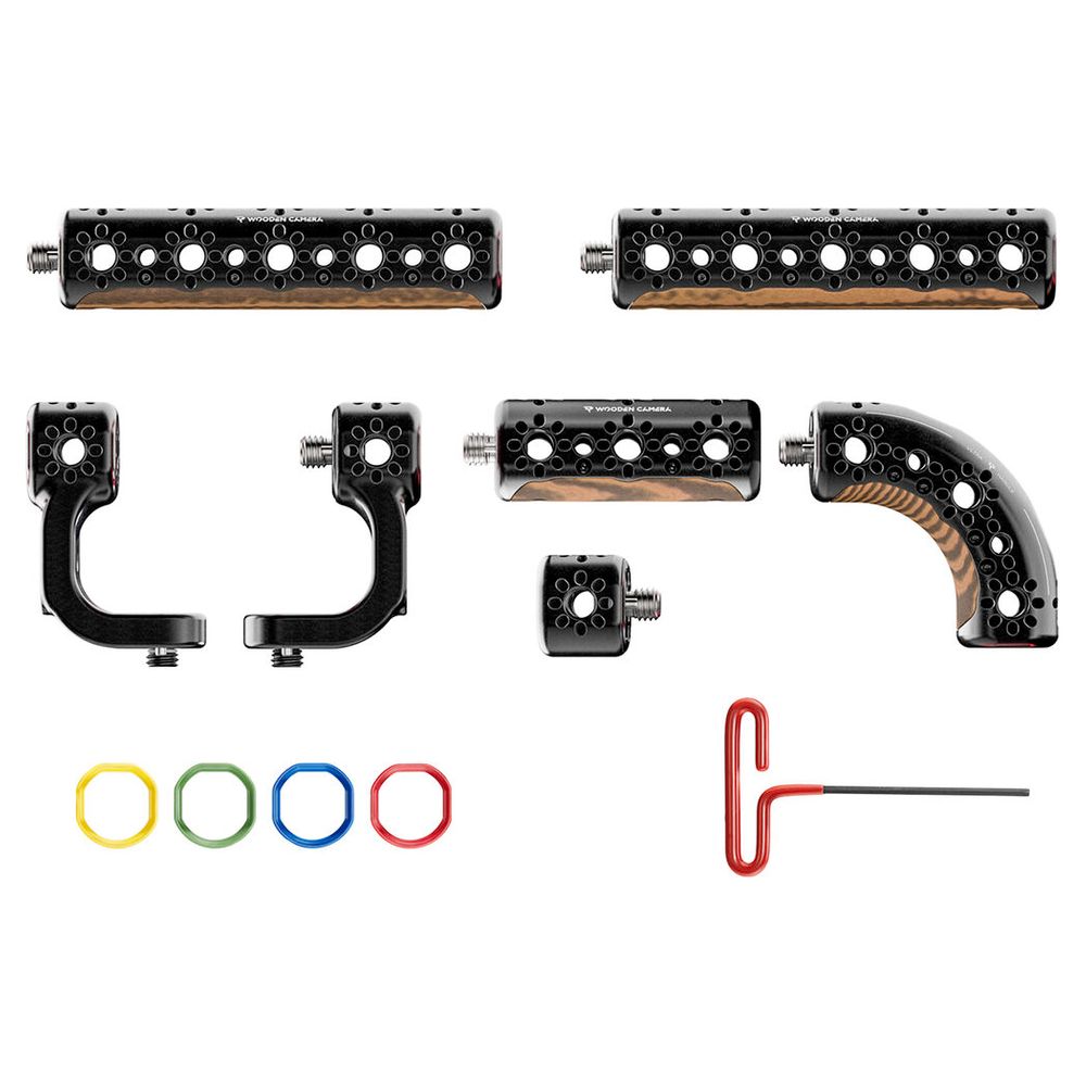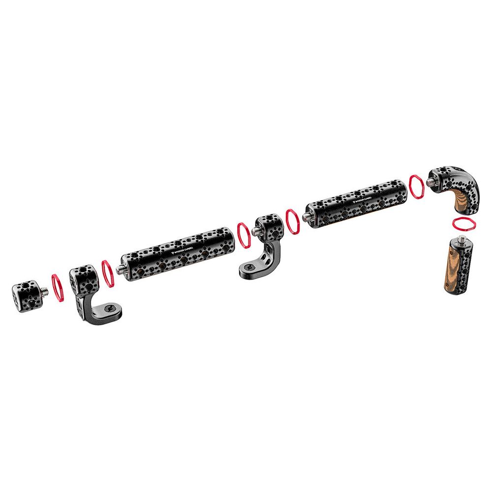 This Ultra Handle System from Wooden Camera combines modular components to create a custom-configurable handle for your camera rig. Included in the complete system are two 5" extensions, one 3" extension, one 1" extension, a front connector, a rear connector, and a pack of multicolored rings. Various mounting threads and 3/8"-16 screws secure each part to one another, along with the included Allen wrench. Four mounting screws on the connectors attach the 15.7" assembled handle to your camera's top plate.