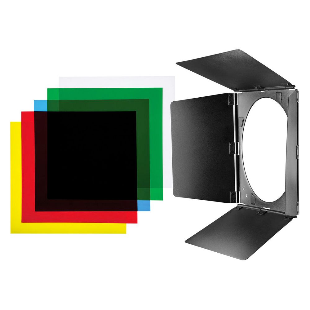 Pair this barndoor set with the separately-purchased 70-Degree Wide Reflector to gain even further directional light control. These barndoors quickly attach to the reflector and feature four leaves that move independently for precise directional control. This barndoor set also includes red, blue, green, yellow, and diffusion gels used to help create dramatic effects or change the color of backgrounds.