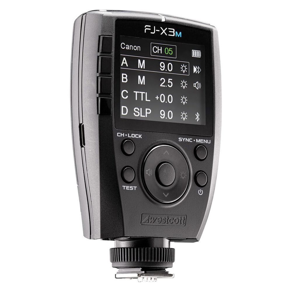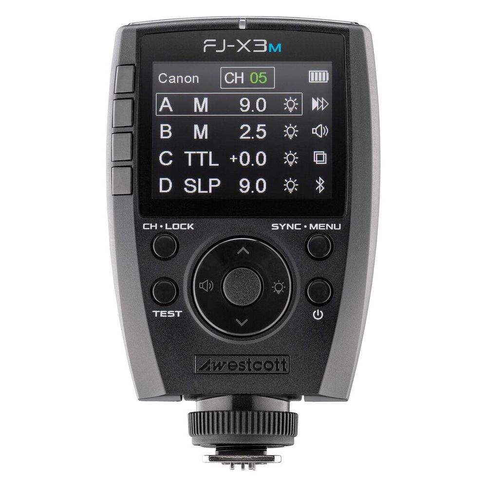 The Westcott FJ-X3 M Universal Wireless Flash Trigger is equipped with multi-brand technology that pairs with most camera brands to trigger the FJ Wireless and Canon RT devices. This 2.4 GHz remote offers revolutionary compatibility with many Canon, Nikon, Sony (with adapter), FUJIFILM, Panasonic Lumix, and Olympus cameras. The FJ-X3 M mounts to a camera's hot shoe to wirelessly control multiple FJ400s, FJ200s, FJ80s, FJ-XR receivers, or Canon RT devices. Get reliable wireless connectivity up to 300m with enhanced performance in high-interference locations like weddings and events. It runs on a long-lasting removable lithium-ion battery. The FJ-X3 M is designed with a large display, user-friendly menu, and multi-select control pad for making quick adjustments. Functions include TTL, High-Speed Sync, Front and Rear Curtain Sync, Canon RT flash compatibility, group and channel assignment, Group Exposure Compensation, TTL to Equivalent Manual, modeling lamp settings, and much more.