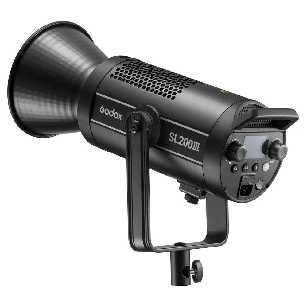The SL200III also has eight special effects, including flash 1, 2, 3, broken bulb, storm 1, 2, 3, and television. The fixture has a well-designed yoke that can rotate 360° to accommodate large modifiers or subjects close to the light. This light is ready for worldwide use via its 100-240 VAC multi-voltage power supply.