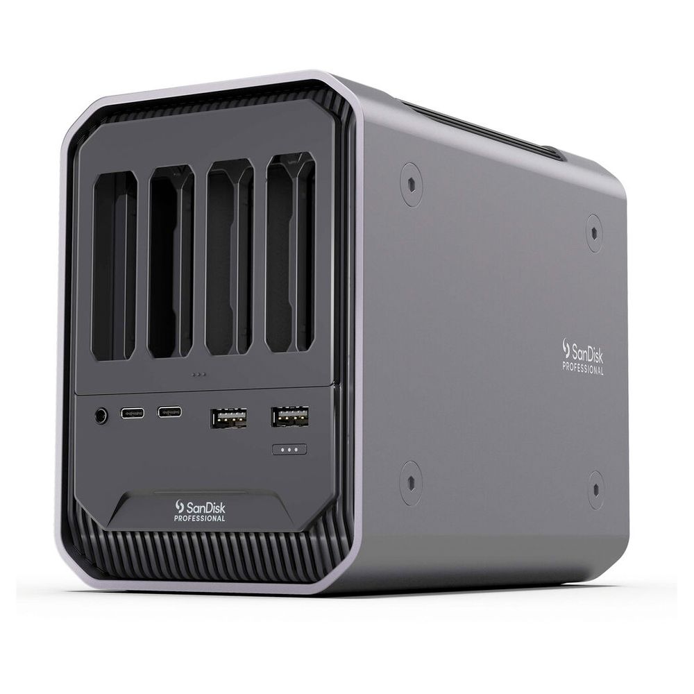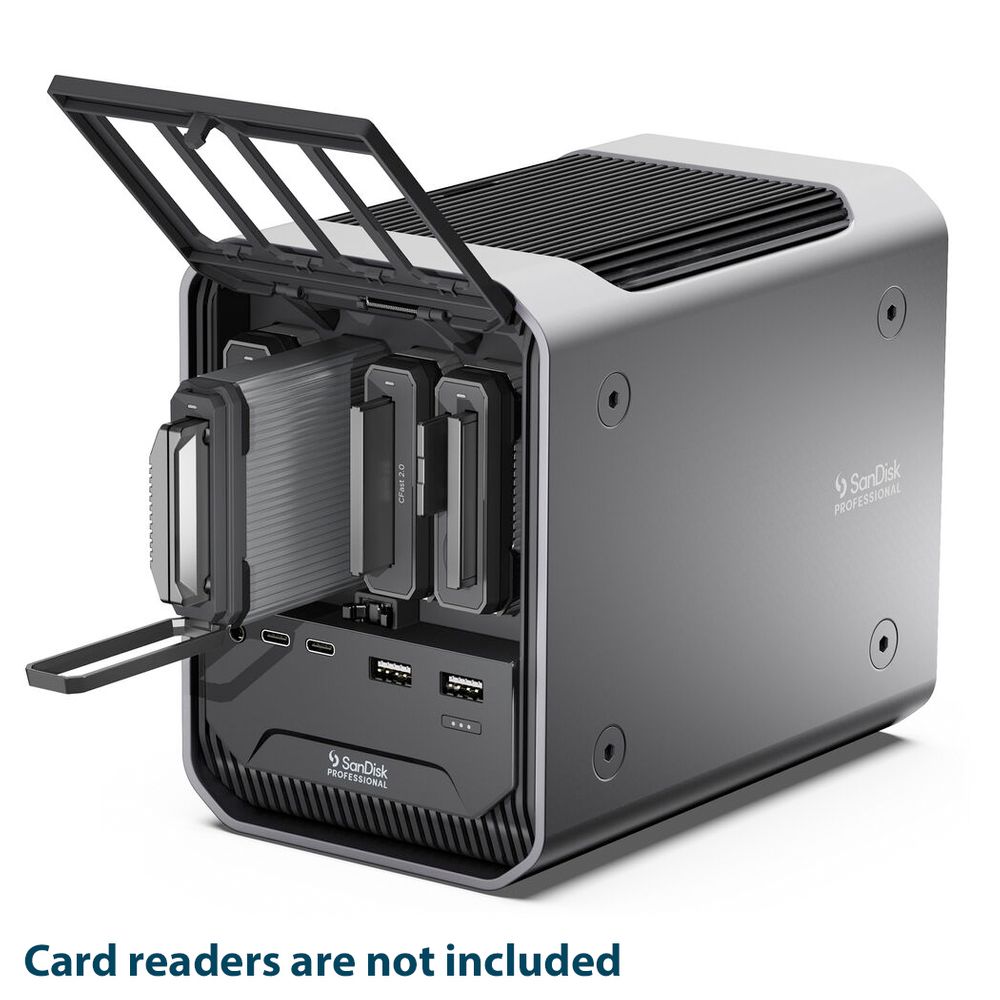 Connect your displays, card readers, A/V devices, Gigabit Ethernet, and more, all by running a single cable to your computer's Thunderbolt 3 port with the PRO-DOCK 4 from SanDisk Professional. This docking station interfaces with your host Windows or Mac system using one of its Thunderbolt 3 ports and an included 2.6' Thunderbolt 3 cable, while also featuring four card reader bays designed for SanDisk's PRO-READER series that let you engage in simultaneous, high-speed media offloading. Other integrated ports include a second Thunderbolt 3 port, two 10 Gb/s USB-C 3.2 Gen 2 ports, two 5 Gb/s USB-A 3.2 Gen 1 ports, one DisplayPort 1.4 port, a Gigabit Ethernet port, and a 3.5mm headphone/mic combo jack.