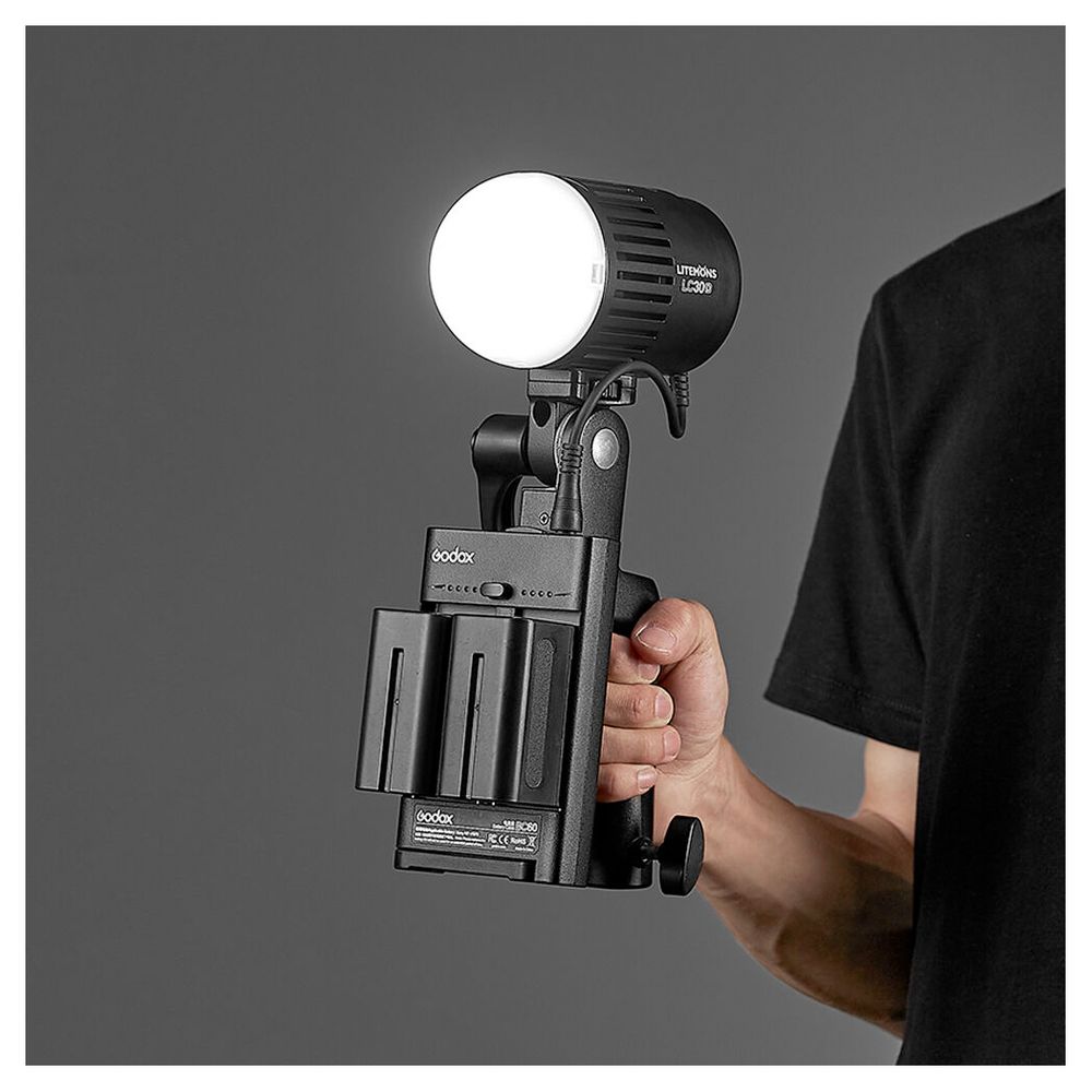 The ML-AK Accessory Kit from Godox is assembled with a battery plate for two L-series batteries, a handle, and a DC cable. Designed for use with the ML Series, LC30D, and LC30Bi LED lights, this kit extends the lights's powering method.