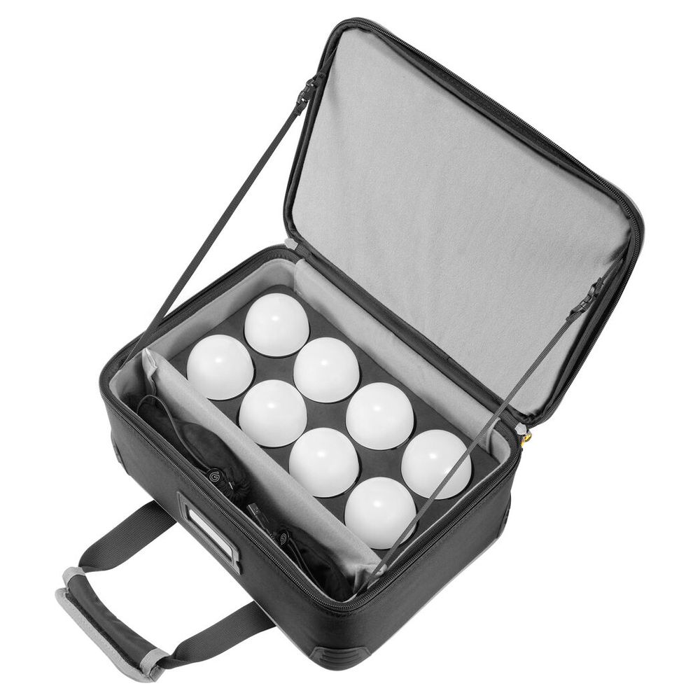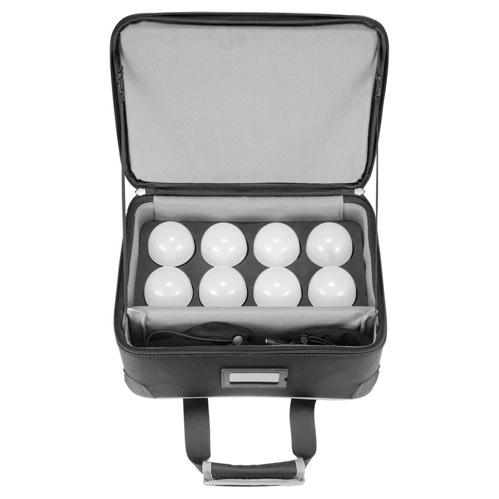 A simple and effective tool for bringing sets to life, this 8-light kit of the C10R KNOWLED RGBWW Creative Bulb from Godox comes with a charging case with a socket to recharge each bulb, two USB-C cables, a power cord, and eight round cup bouncer diffusers for additional light modification.