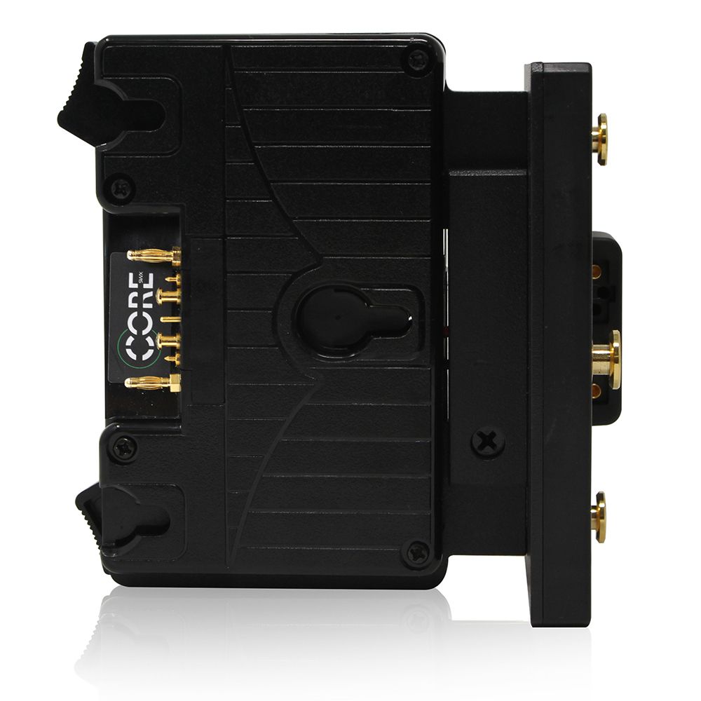 Use this Helix Gold Mount Hot Swap/Shark Fin Battery Mount Plate to power a Gold Mount camera using a 14V Gold mount battery. The plate provides 11 to 34 VDC input and output, and up to 33.6 VDC when using Helix battery packs.