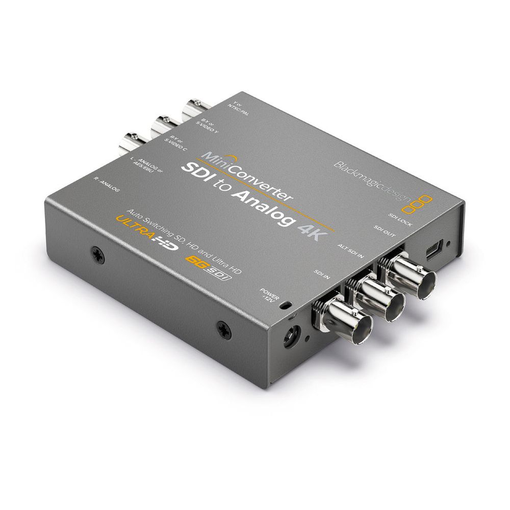 The Mini Converter SDI to Analog 4K from Blackmagic Design allows you to convert Single Link SD/HD/3G/6G-SDI to analog SD/HD component, composite, or S-Video. The down-converter lets you to connect professional SDI equipment which outputs resolutions up to Ultra HD 4K (3840 x 2160) and DCI 4K (4096 x 2160) with SD and HD analog video monitors and other equipment. With a compact form factor and easy-to-use controls, the Mini Converter is ideal for a variety of broadcast, post production, and professional AV applications.
