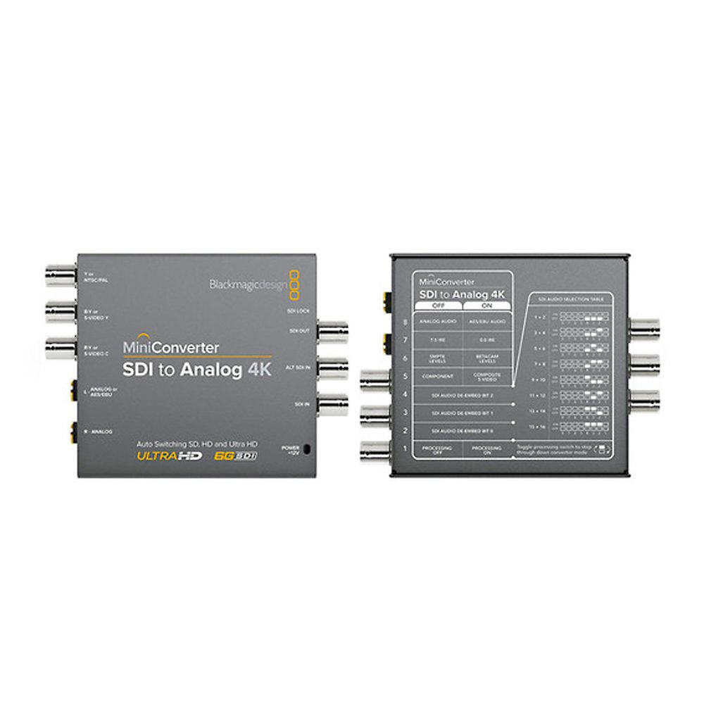 The Mini Converter SDI to Analog 4K from Blackmagic Design allows you to convert Single Link SD/HD/3G/6G-SDI to analog SD/HD component, composite, or S-Video. The down-converter lets you to connect professional SDI equipment which outputs resolutions up to Ultra HD 4K (3840 x 2160) and DCI 4K (4096 x 2160) with SD and HD analog video monitors and other equipment. With a compact form factor and easy-to-use controls, the Mini Converter is ideal for a variety of broadcast, post production, and professional AV applications.
